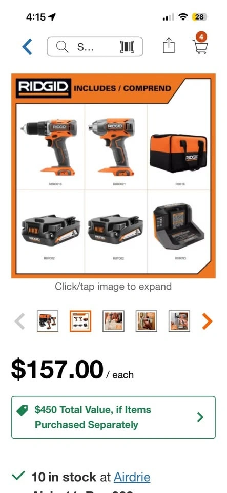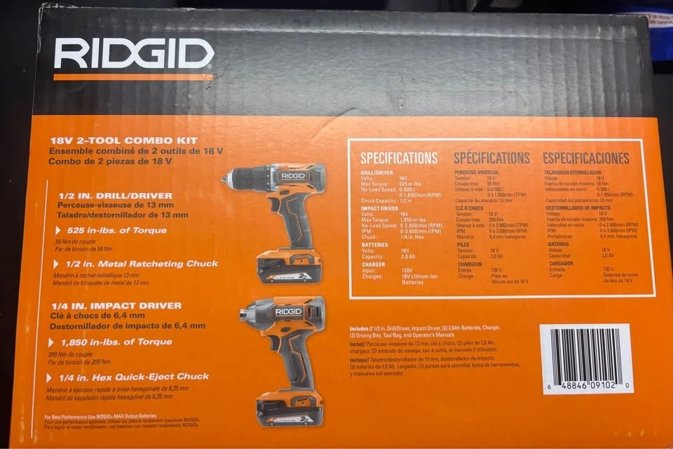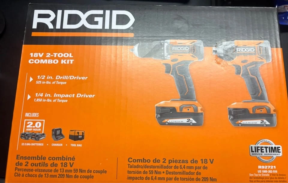 Brand new RIDGID 18V 2-Tool Combo Kit, still sealed in the original box. Includes a 1/2 inch drill/driver and a 1/4 inch impact driver. Comes with two 2.0Ah batteries, a charger, and a tool bag. Model R92721. Pick up in SW Airdrie.