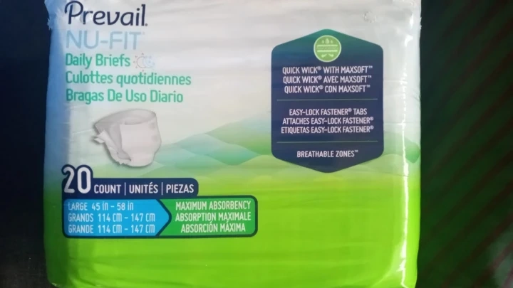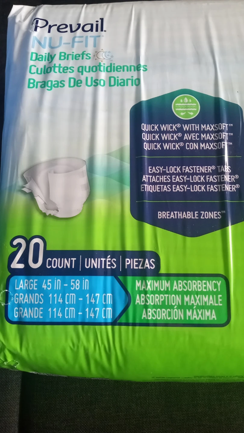 Selling 4 packs of Prevail NU-FIT Daily Briefs. Size large (45 in - 58 in). The pack contains 20 briefs and features quick wick with maxsoft, easy-lock fastener tabs, breathable zones.