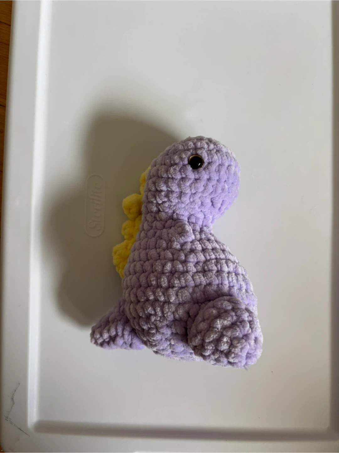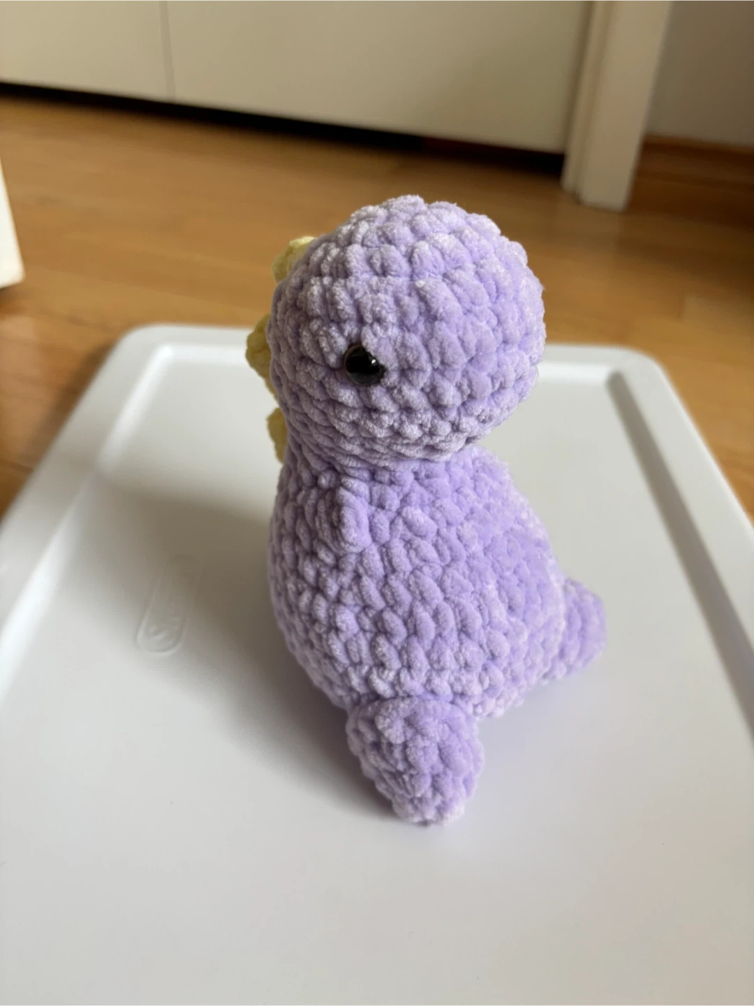 This is a cute, handmade crocheted dinosaur plush toy. It's a soft purple colour with yellow spikes on its back. Made from plush yarn, it's perfect for cuddling or decorating a child's room.