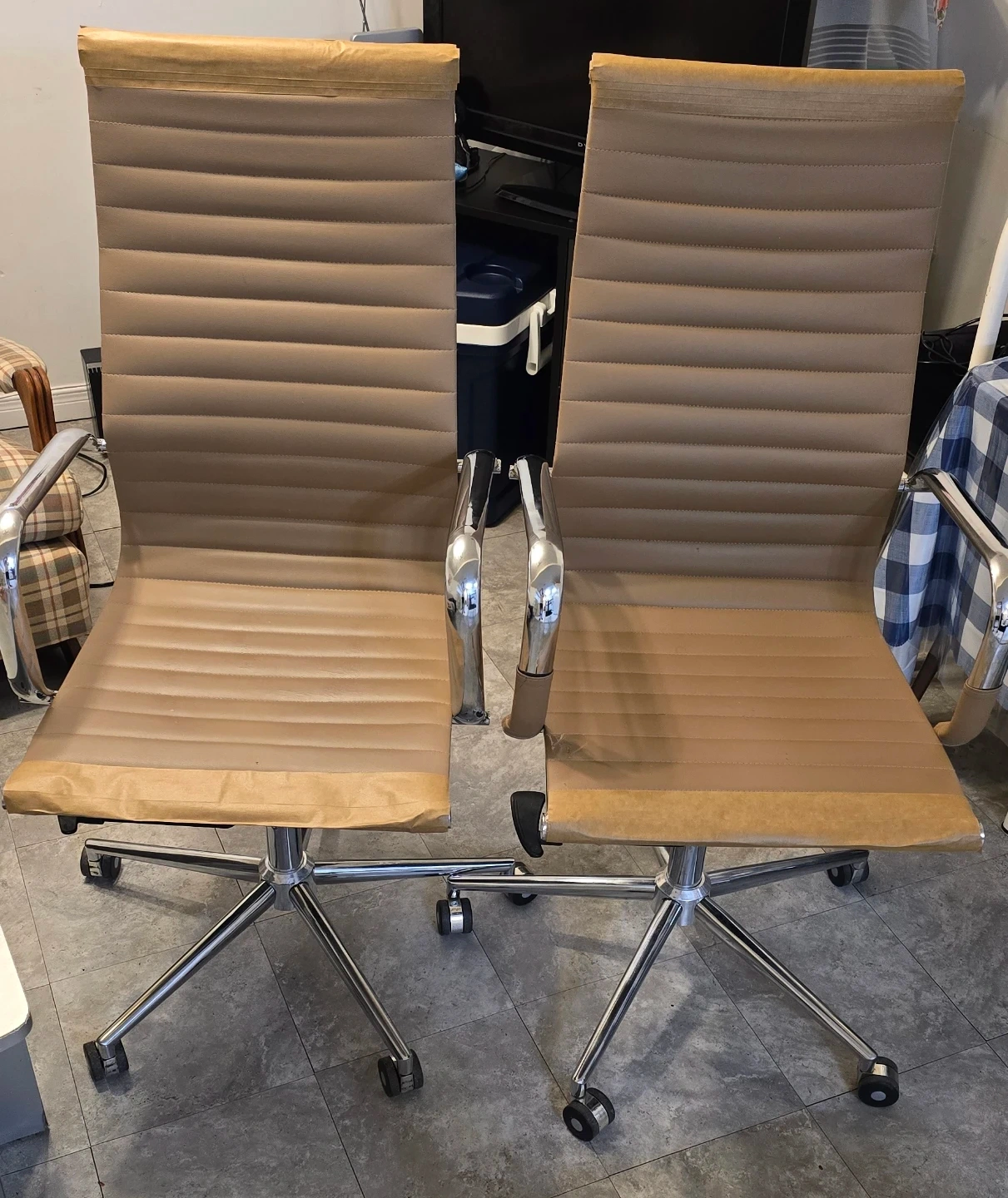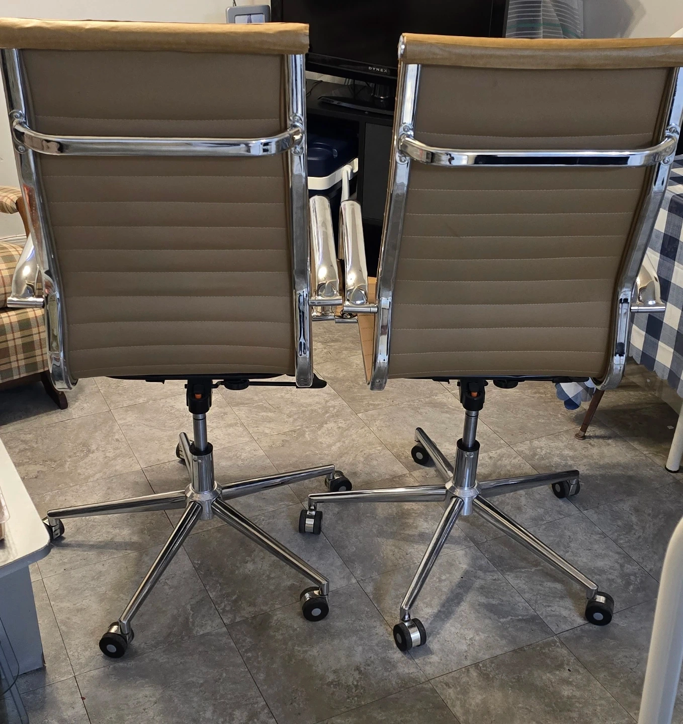 Selling a set of two tan office chairs. They feature a high-back design with ribbed upholstery and a polished chrome base with wheels. These chairs are adjustable for height and swivel. They're great for any home office or workspace!