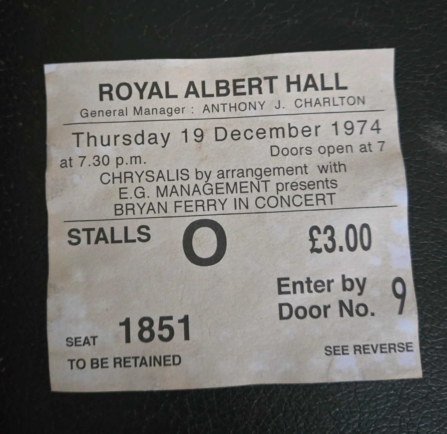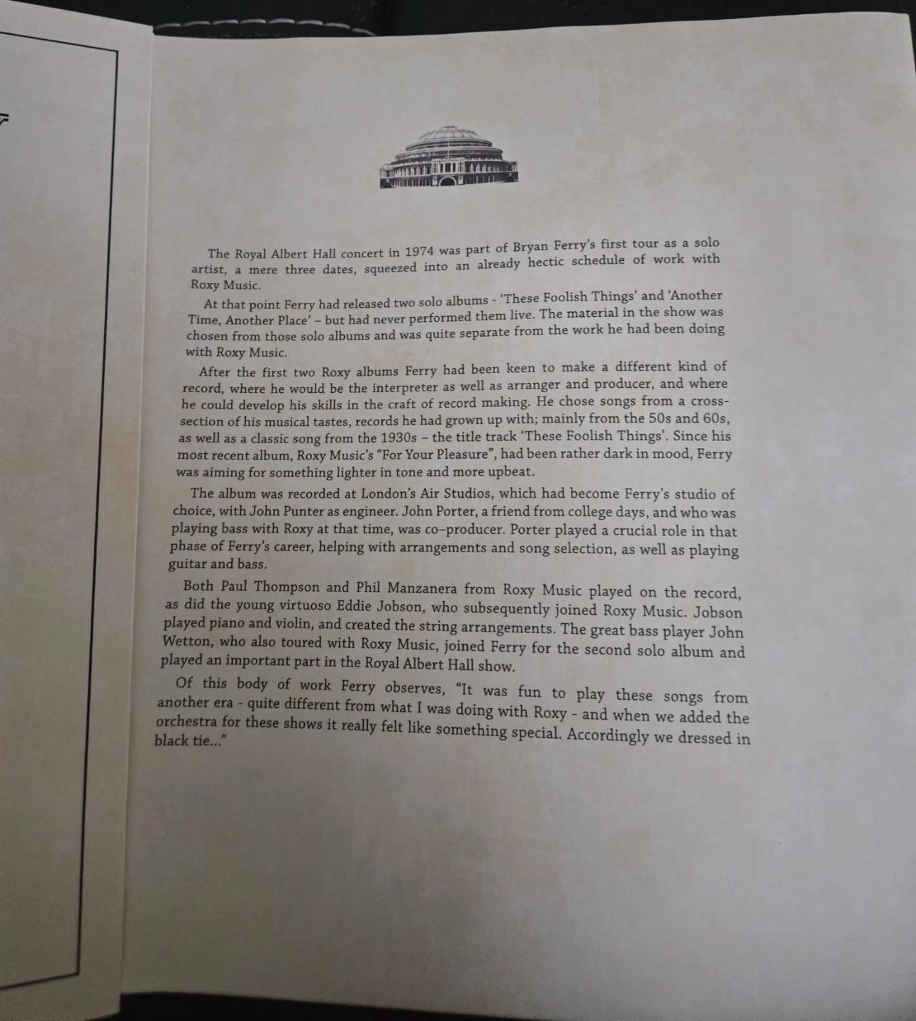 This is the Bryan Ferry 'Live at the Royal Albert Hall 1974' box set. It contains a record, ticket stub, letters, and related documents from the era. The box set includes photos and printed materials from the event. Plus a CD. This is extremely limited and perfect for any Ferry or Roxy Music fan!