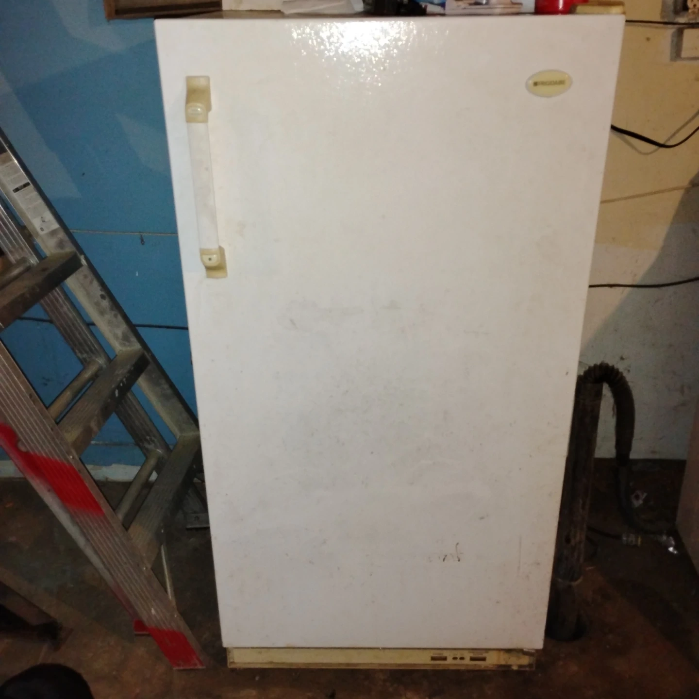 This is a Frigidaire upright freezer. It features a temperature alarm and a power on light. It also has a "Frost-Free" feature for convenience. The freezer uses manual low-frost defrosting.