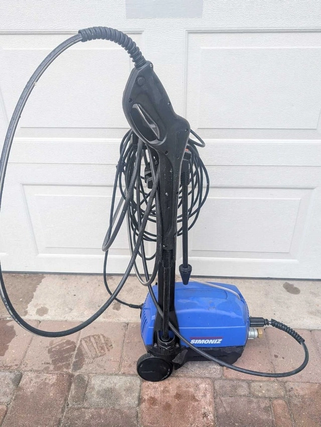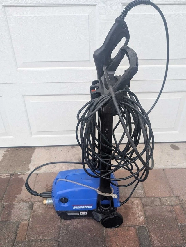 Simoniz 1,400 PSI electric pressure washer, perfect for various cleaning tasks around your home. It's in Very Good condition and ready to get back to work. - Brand: Simoniz - Model:LR54005 - Approx. measurements: 36"H x 12"W x 18"D - Power: 120V AC, 60Hz, 13A, 1PH, 2-prong plug (NOTE, prongs show some light corrosion) - Output: 1.70 gpm @ 8800 kPa - Plastic body housing - Approx. 26" spray wand with trigger operation - Detergent tank hose (tank not included) - On/off power knob - 2 wheel dolly design with pull handle. Call or text 705-440-9159.