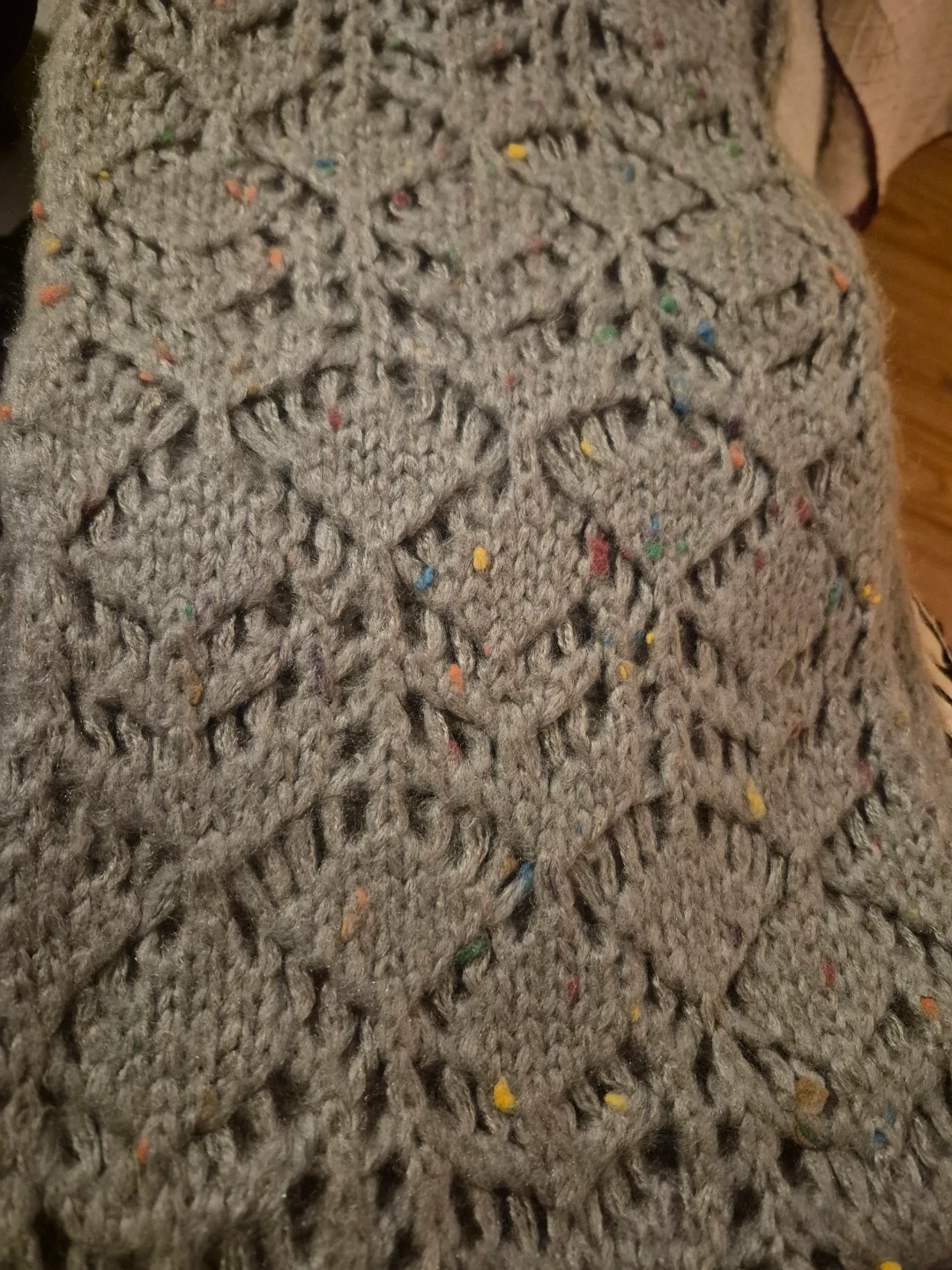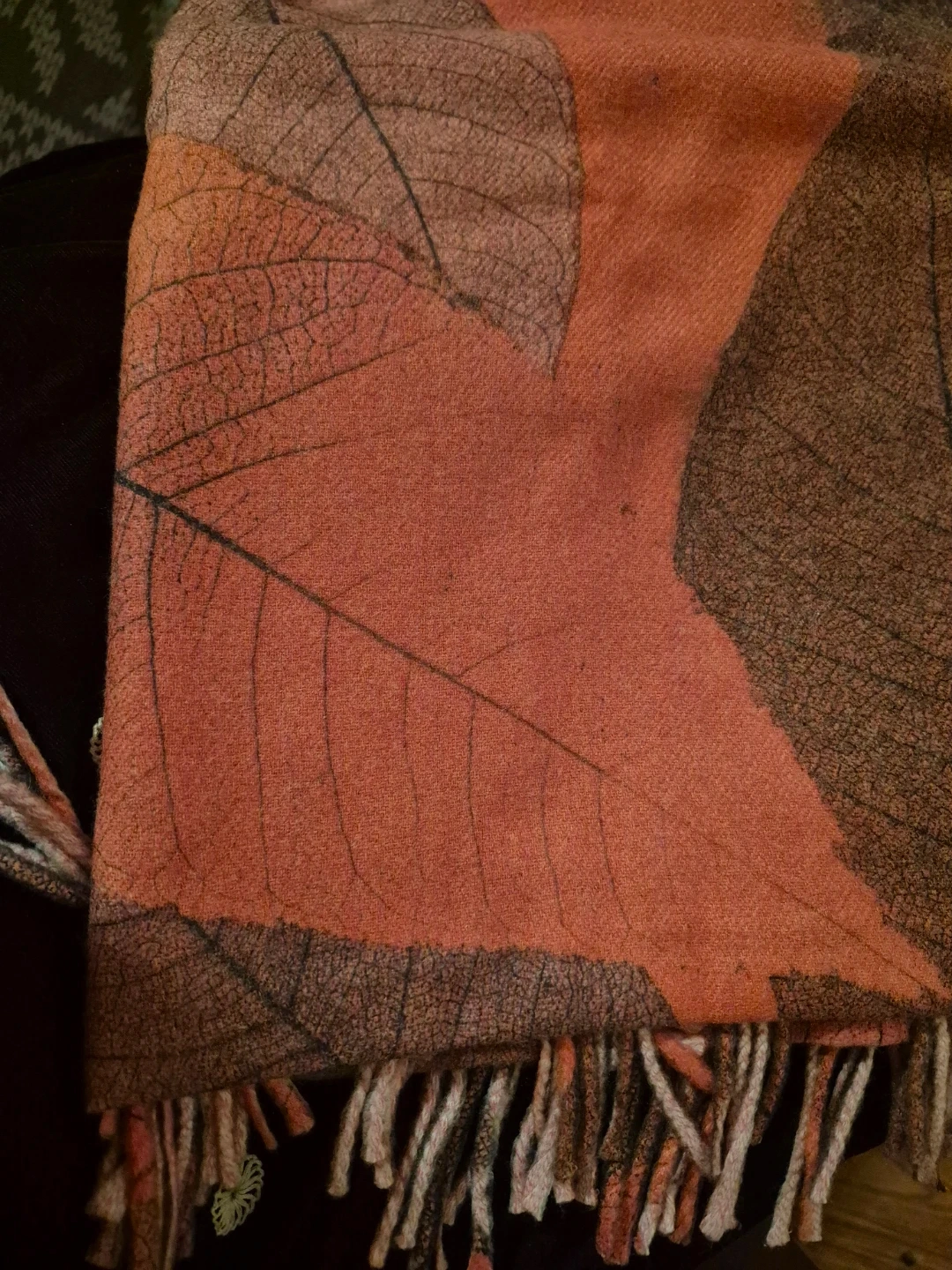 I'm selling two scarves. One is a grey knitted scarf with colourful flecks. The other is a leaf-patterned scarf in shades of orange and brown. Both are in good condition and ready to keep you cozy! Each $10