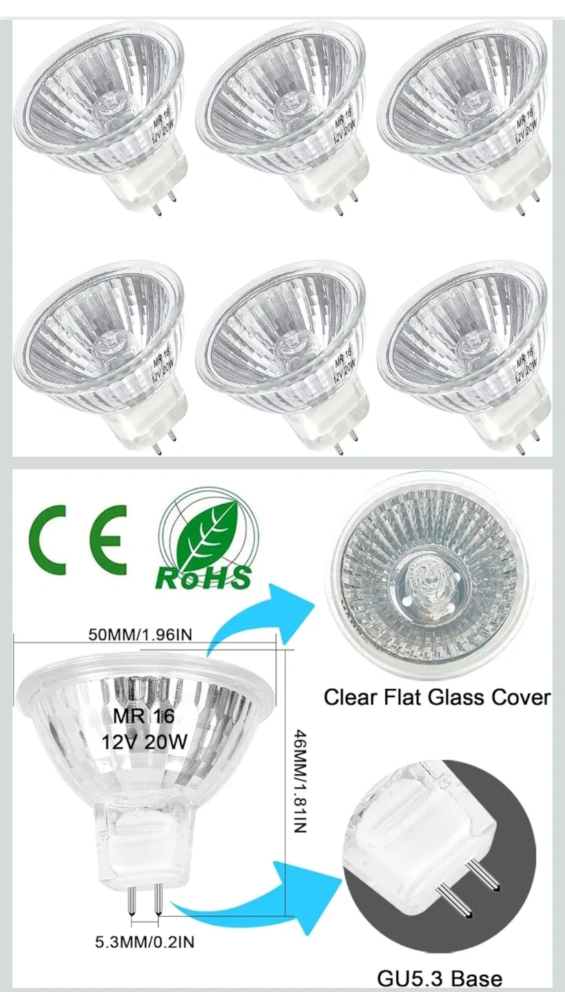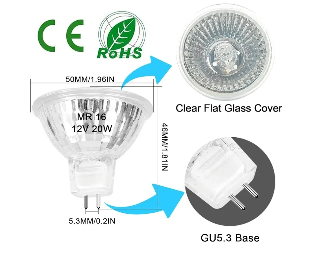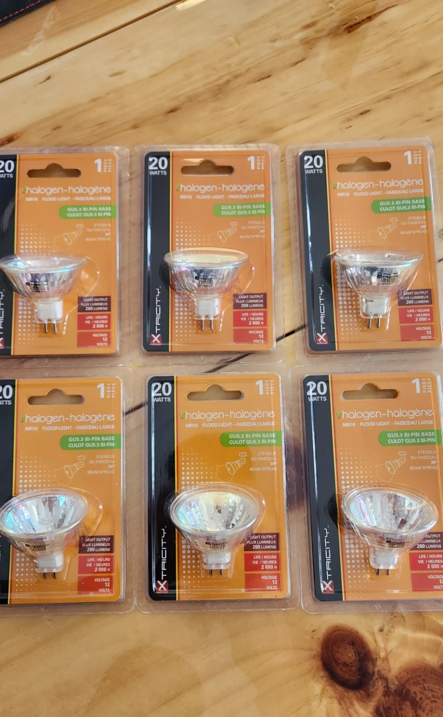 Xtricity halogen floodlight bulbs. MR16 GU5.3 bi-pin base. 20 watts, 12 volts. 2000 hours of life. 260 lumens light output. Beam spread is 36 degrees.
