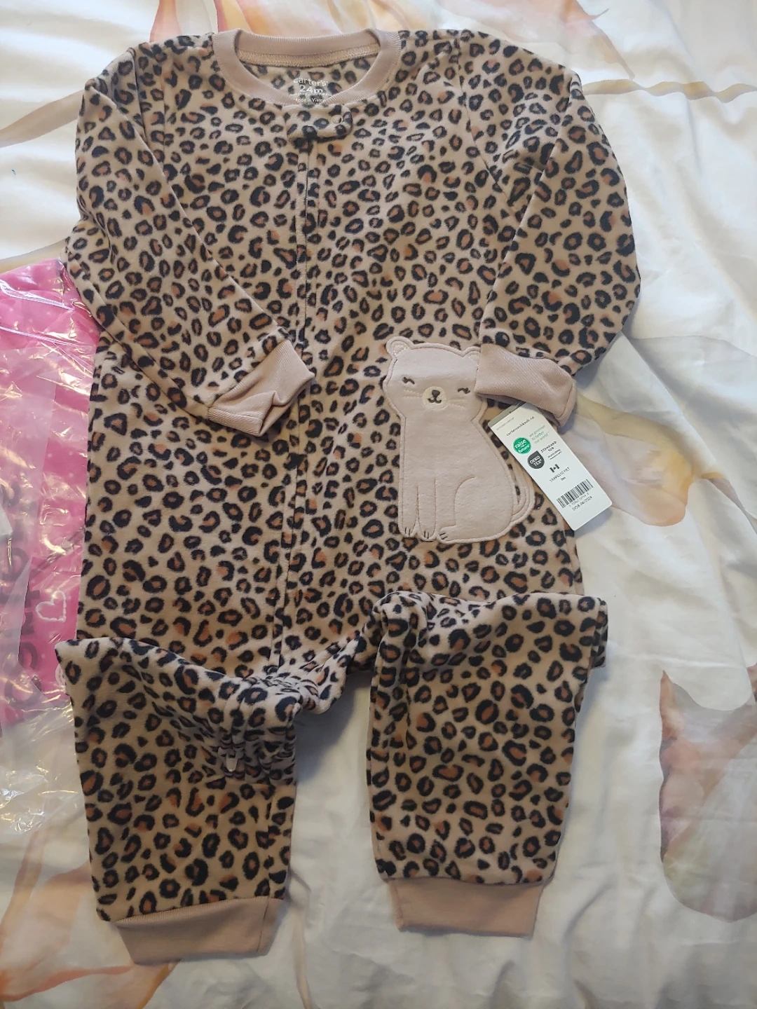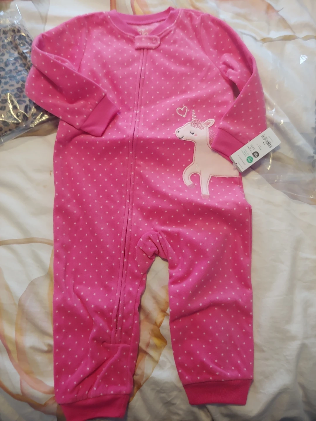 Two brand new cozy fleece footless pajamas for your little one. One features a fun unicorn design with pink polka dots, and the other has a classic leopard print. Both are size 24 months. Both for $10 or $5 each.