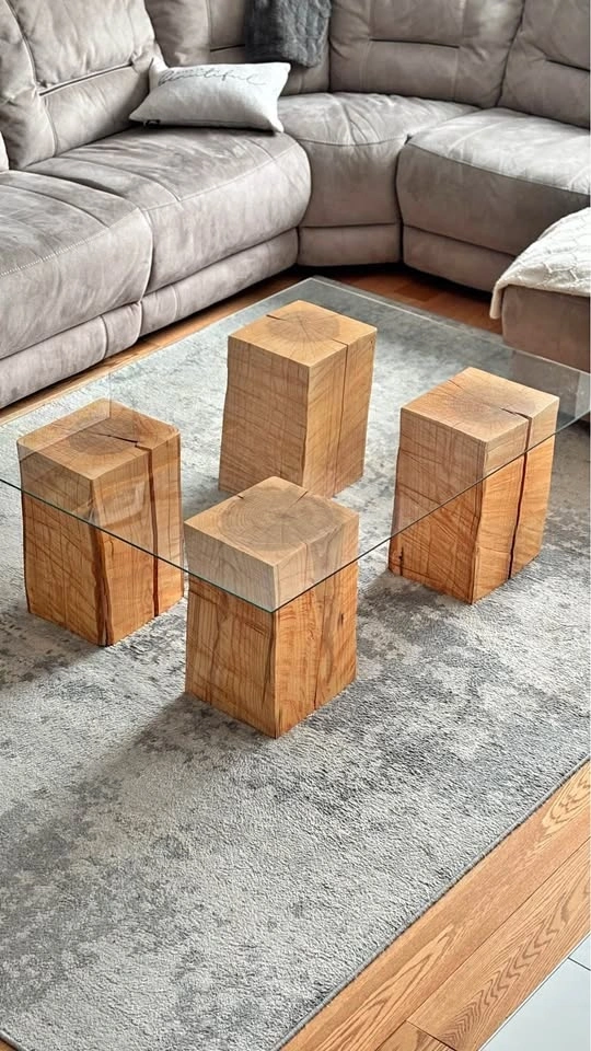 Unique solid ash block coffee table with tempered glass top. Super sturdy and has a natural wood look. Glass is clear. Great for modern or rustic vibes. Glass top 50” x 38”. Solid Ash block legs 10” x 11” x 17” high.