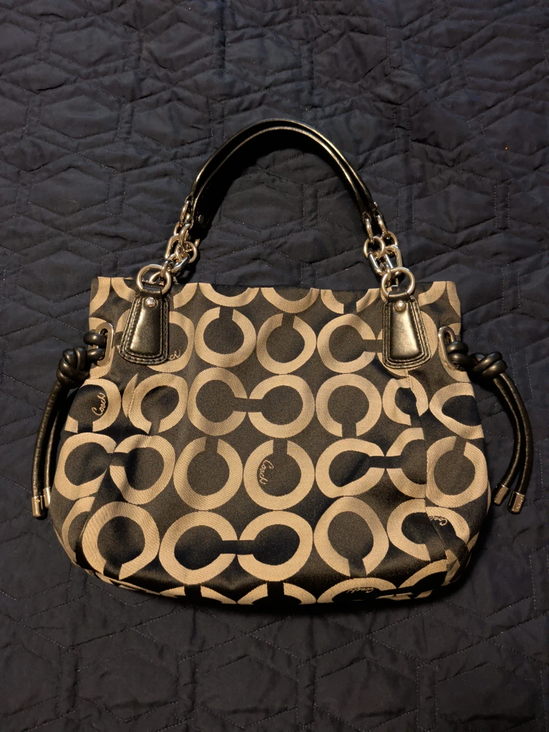 This is an original Coach Signature Collection shoulder bag. It's made of woven jacquard fabric treated to repel water and stains. The pattern is inspired by graphic elements from Coach archives. It's a stylish accessory for everyday use!