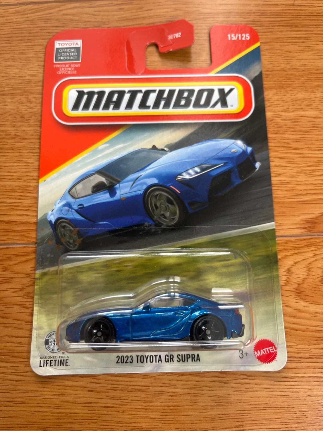 This is a Matchbox die-cast model of the 2023 Toyota GR Supra. It's officially licensed by Toyota. The car is blue with black wheels and is designed for a lifetime of play.