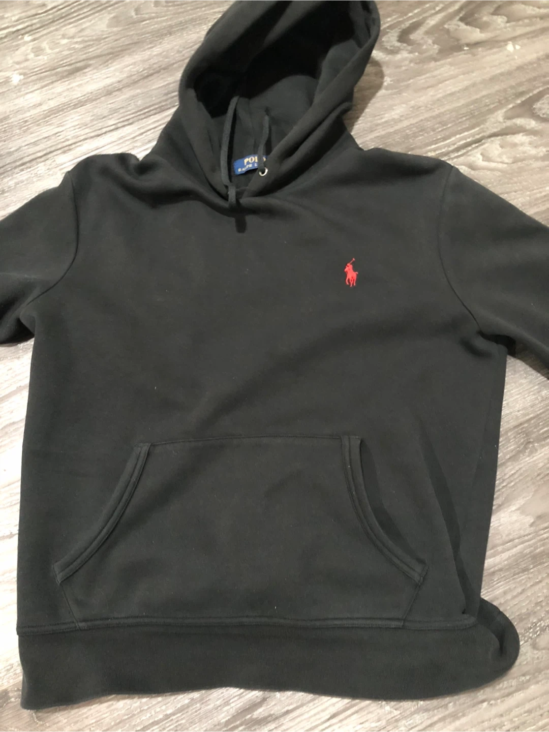 This is a black Polo Ralph Lauren hoodie. It features the signature red embroidered pony logo. The size is small. No rips No stains