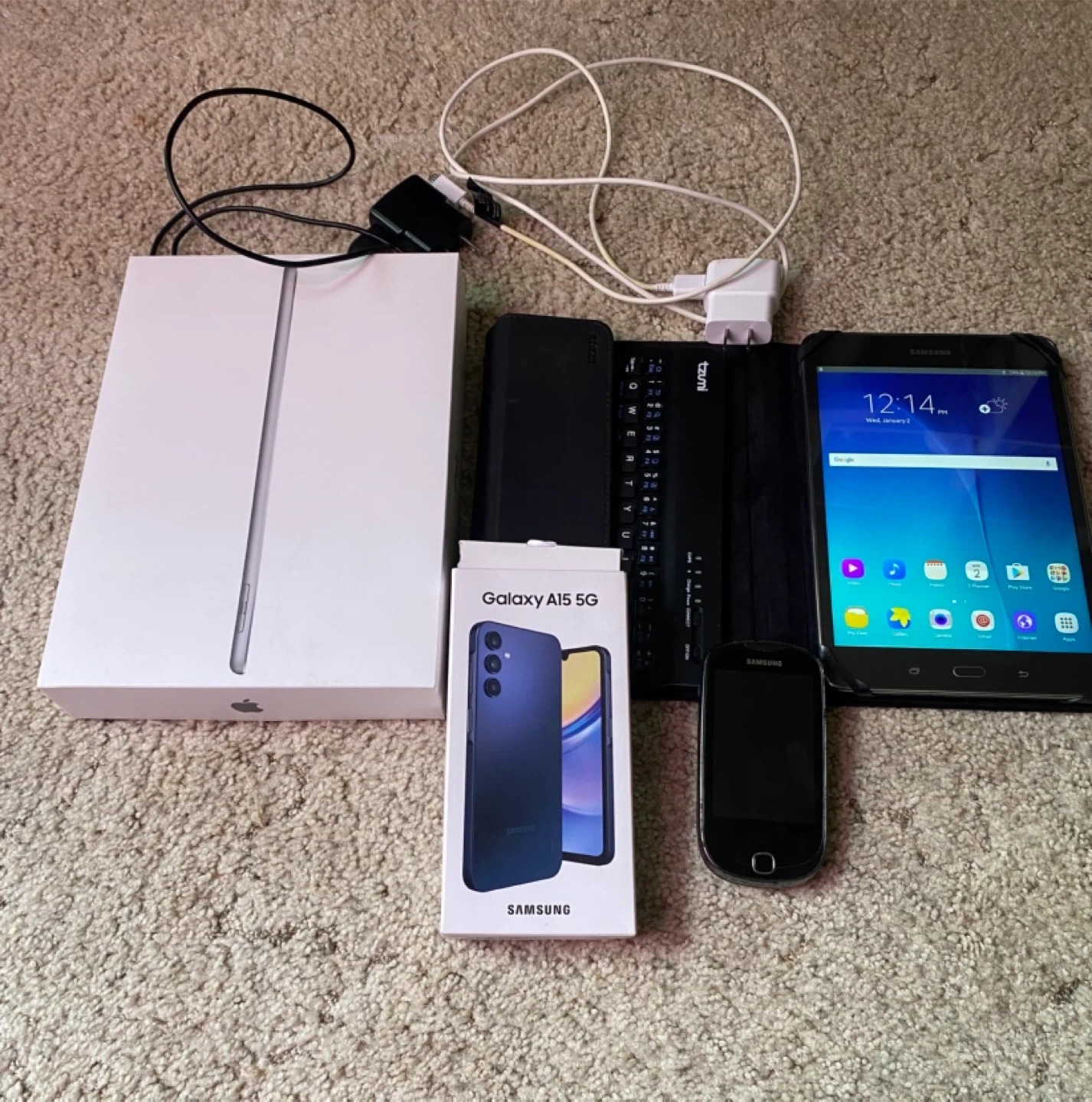 Selling a variety of used electronics! Included are the Samsung Galaxy A15 5G the Apple Ipad (does turn on), Samsung Tablet with Keyboard (used), and a very old Samsung phone.