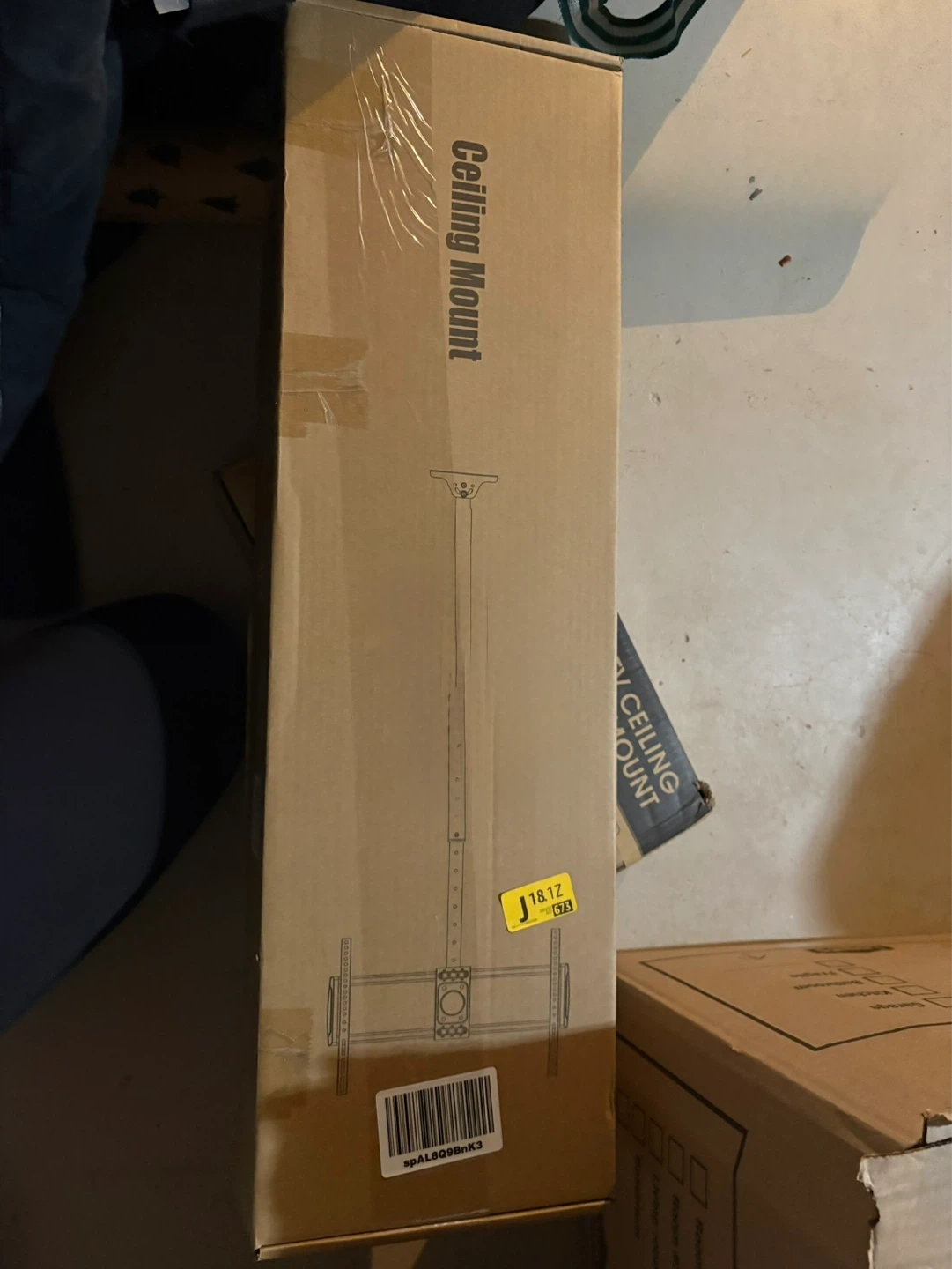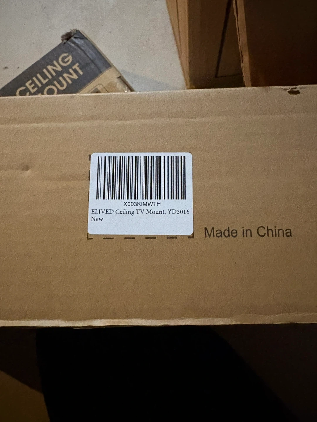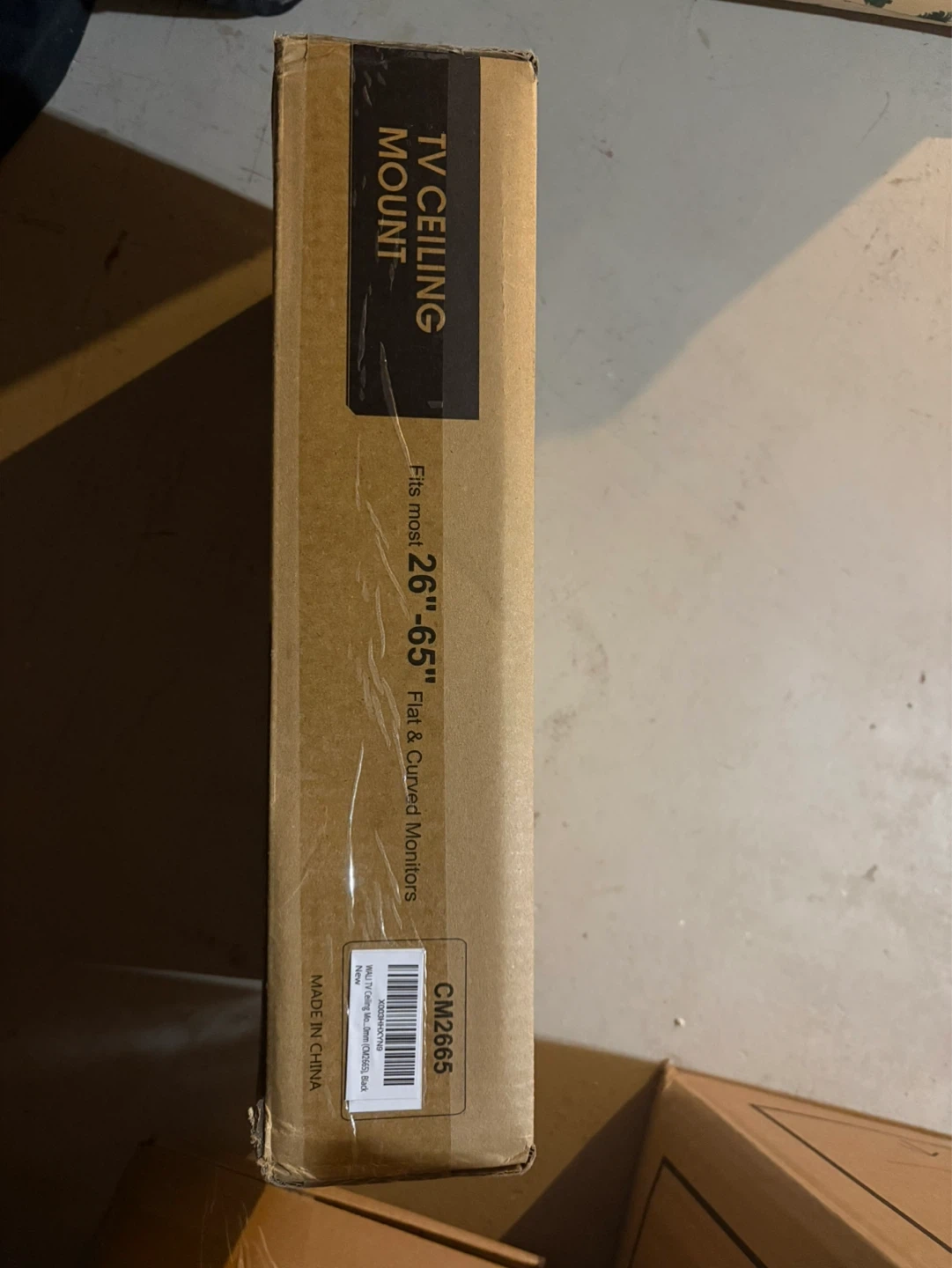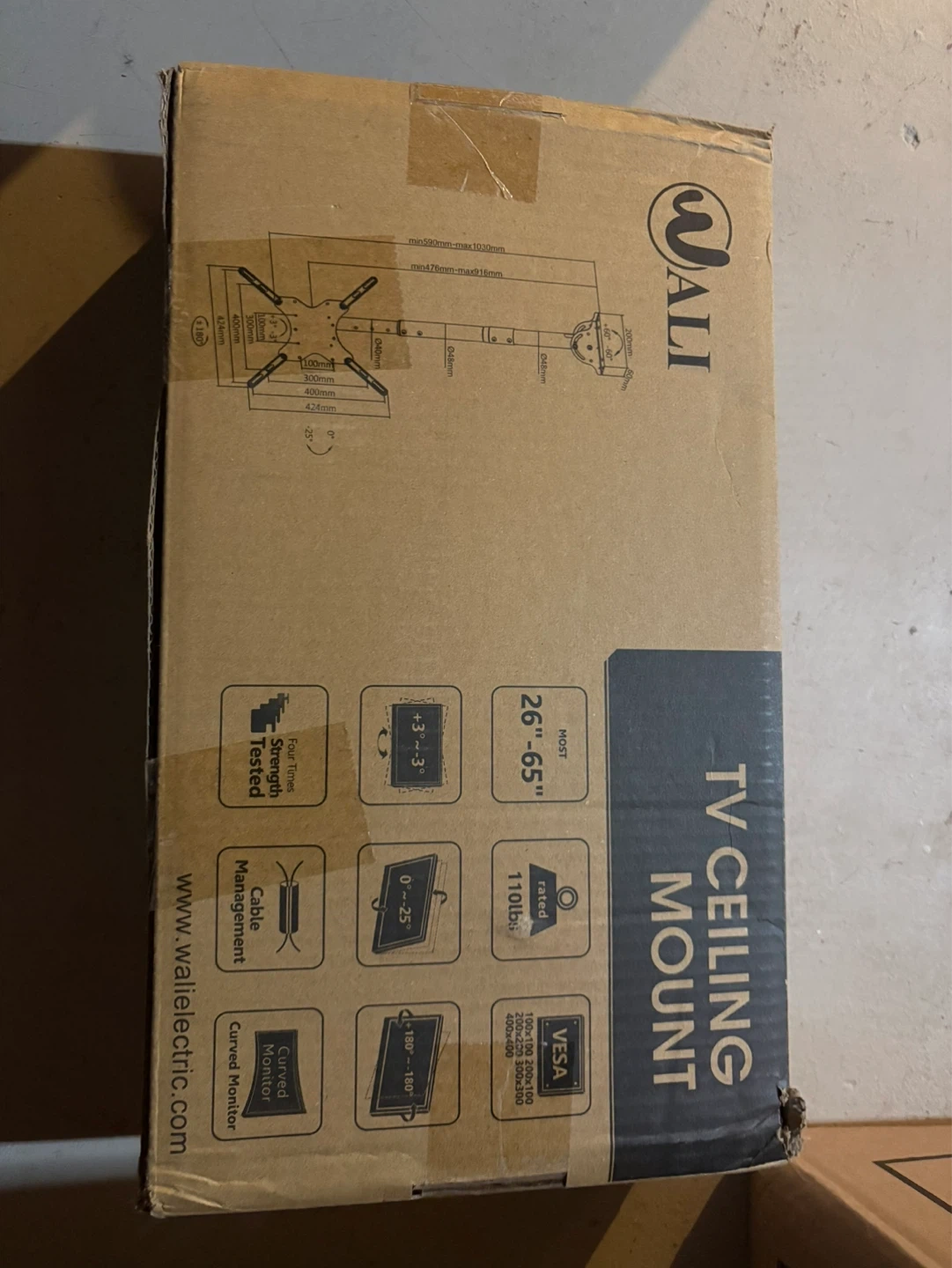 This is a WALI TV ceiling mount. It fits most 26" to 65" flat and curved monitors. The mount supports up to 110 lbs and offers tilt and swivel adjustments.