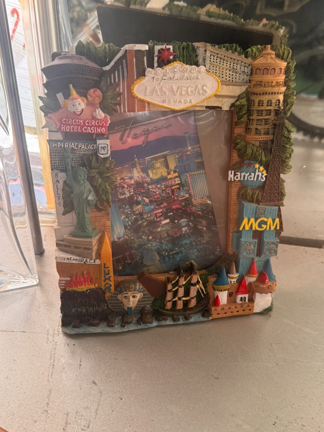 This photo frame is designed with iconic Las Vegas landmarks. It showcases attractions like Circus Circus, Imperial Palace, The Mirage, Luxor, Harrah's, and MGM Grand. It's a great souvenir to display your Vegas memories!