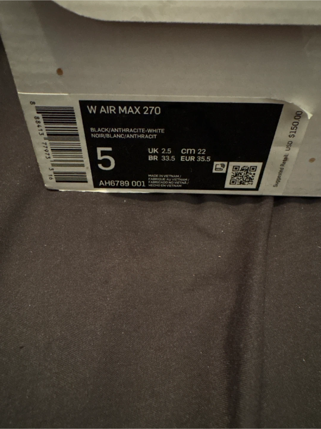 Women's Nike Air Max 270 sneakers in black, anthracite, and white. Original box included. Size 5 (UK 2.5, CM 22, EUR 35.5). Never worn, original box.