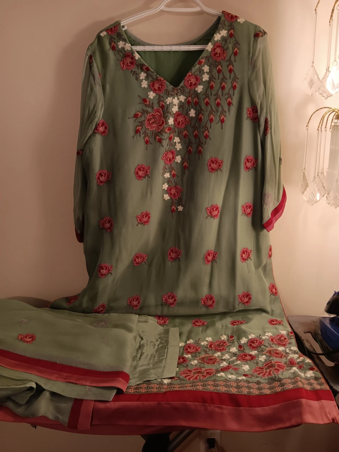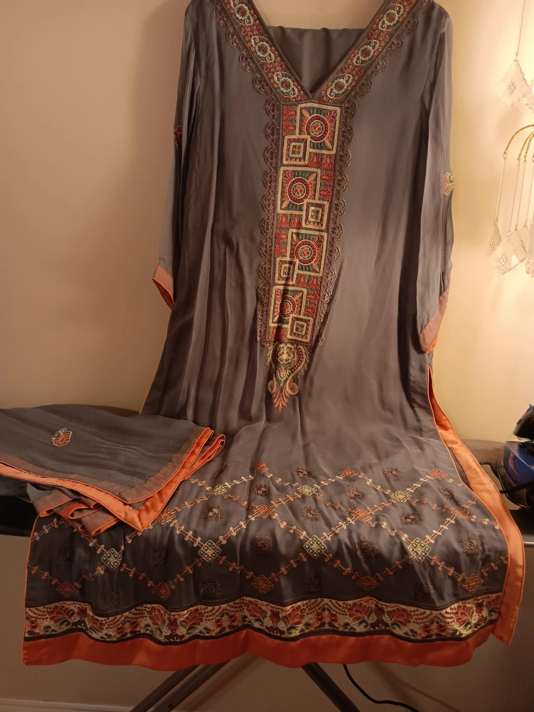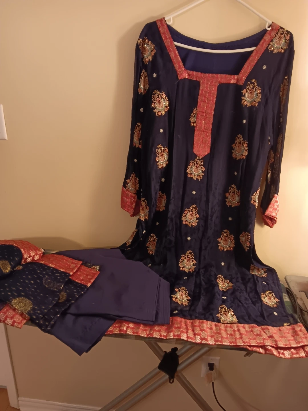 Embroidered kameez shalwar suit. Features intricate embroidery on the neckline and hem. Comes with a matching dupatta. Perfect for cultural events!