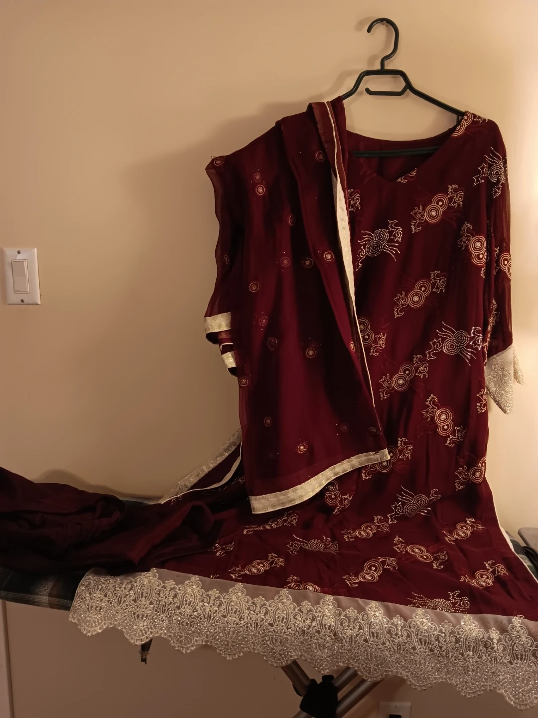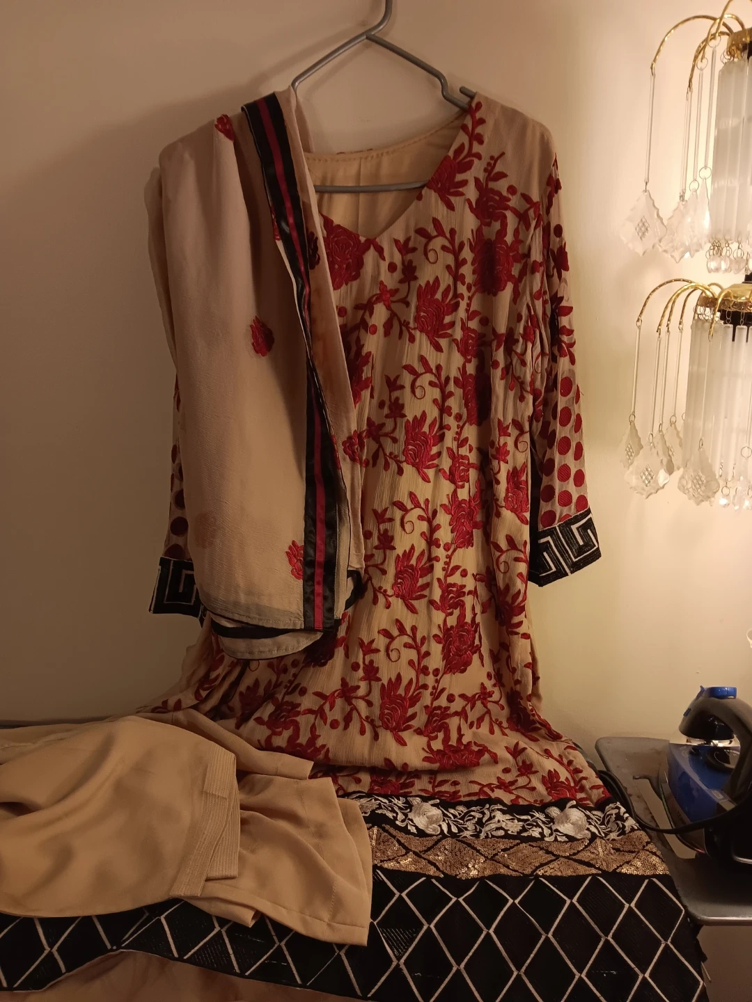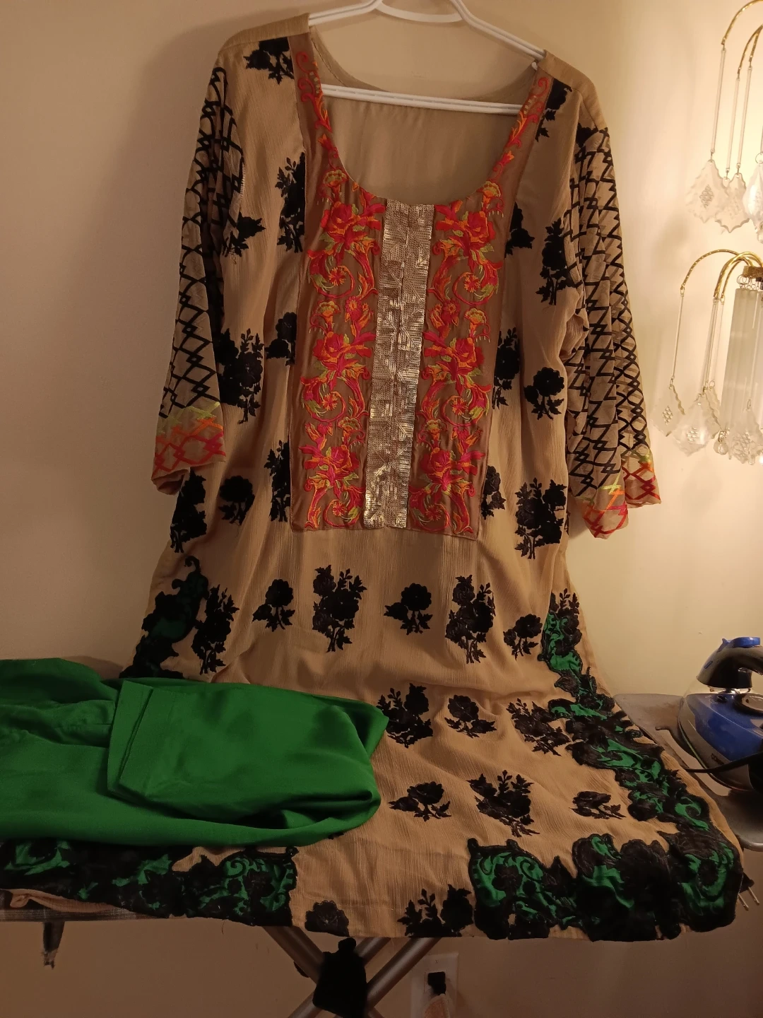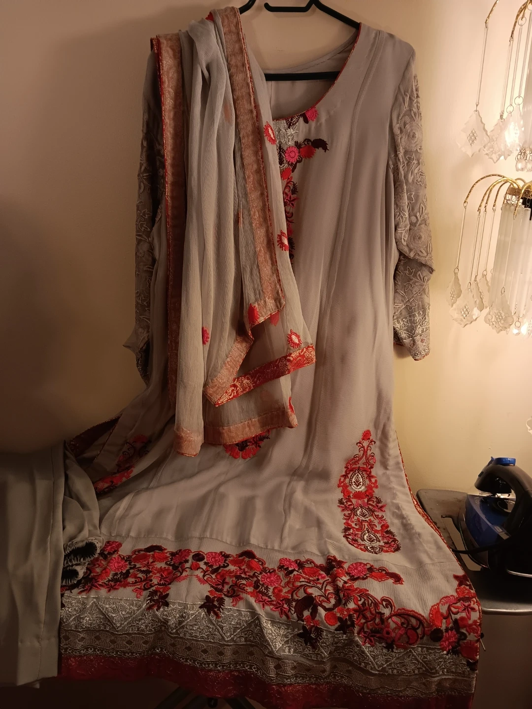 Embroidered kameez shalwar suit. Features intricate embroidery on the neckline and hem. Comes with a matching dupatta. Perfect for cultural events!