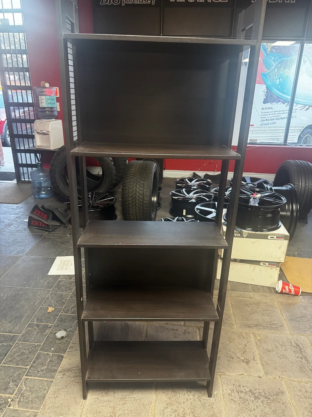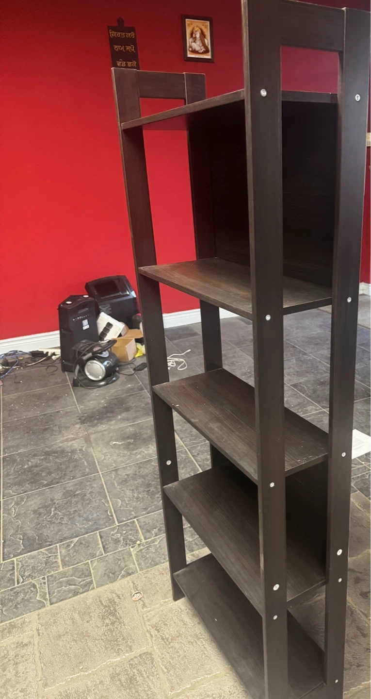 Here's a dark brown leaning ladder shelf, perfect for adding some storage and style to any room! It features multiple shelves, providing ample space for books, plants, or decor. It's in great condition and ready for a new home