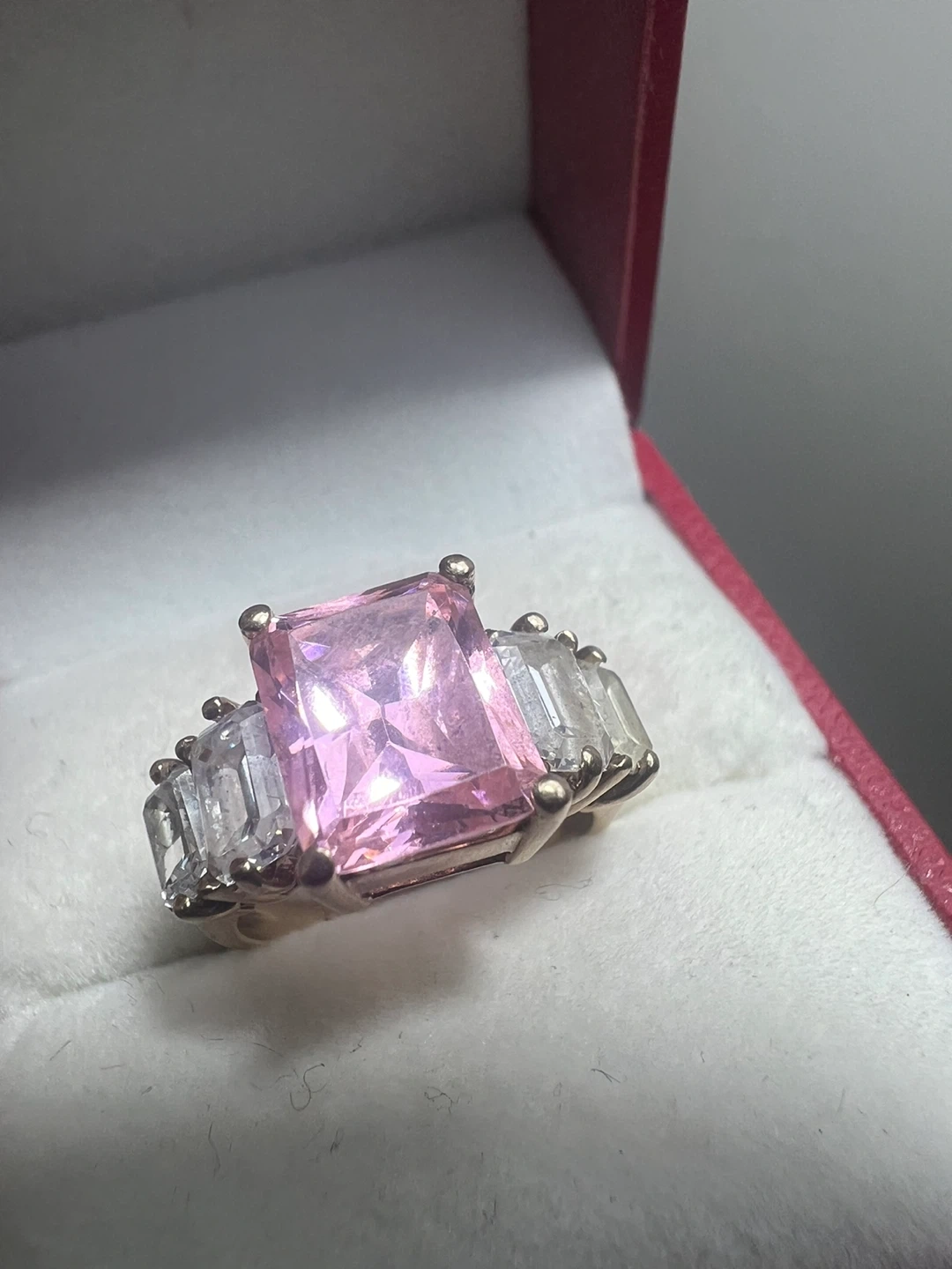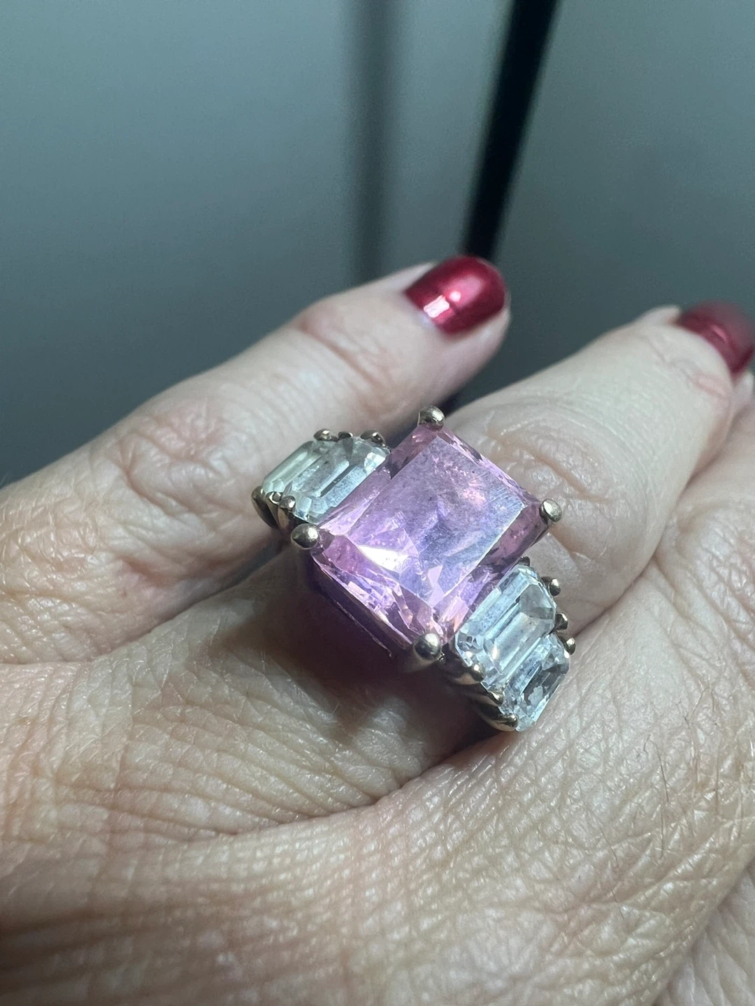 This ring features a central rectangular pink ice gemstone flanked by two clear rectangular gemstones. The band is stamped 10K. It's a lovely statement piece!