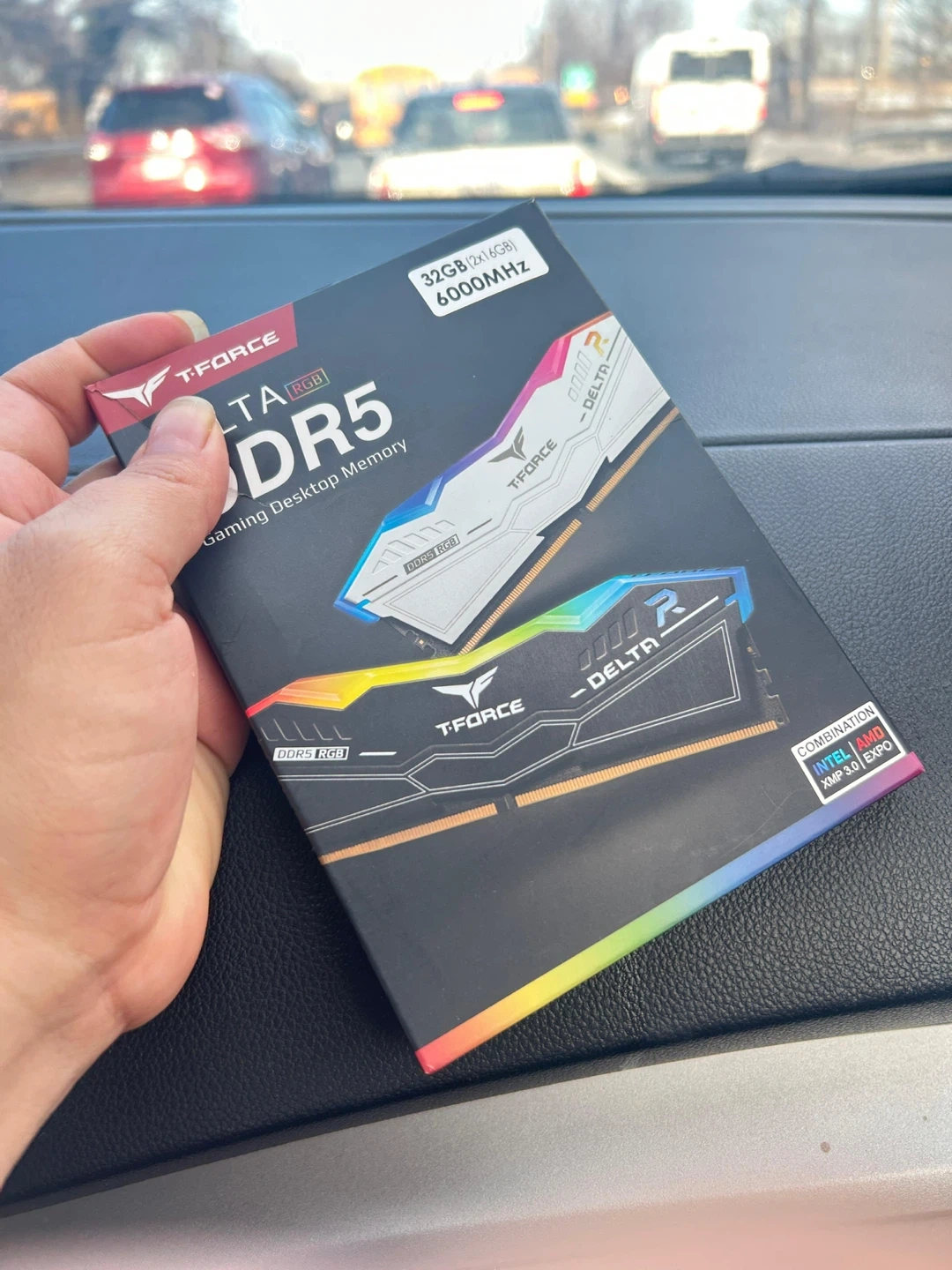 This is a 32GB kit of Teamgroup T-Force Delta RGB DDR5 RAM, with two 16GB sticks. It operates at 6000MHz and features RGB lighting. The memory is designed for gaming desktop PCs. This RAM kit is compatible with Intel XMP 3.0 for easy overclocking.