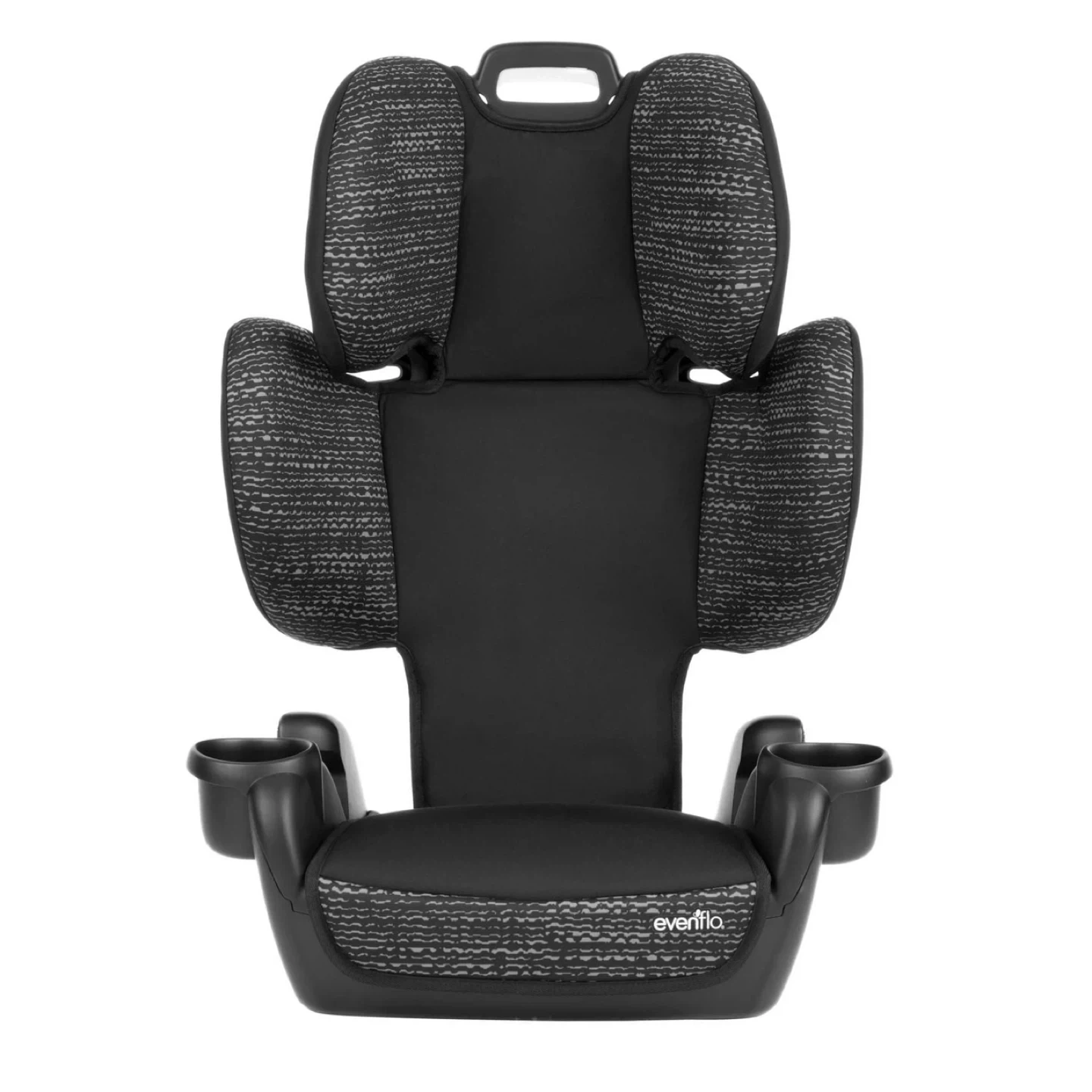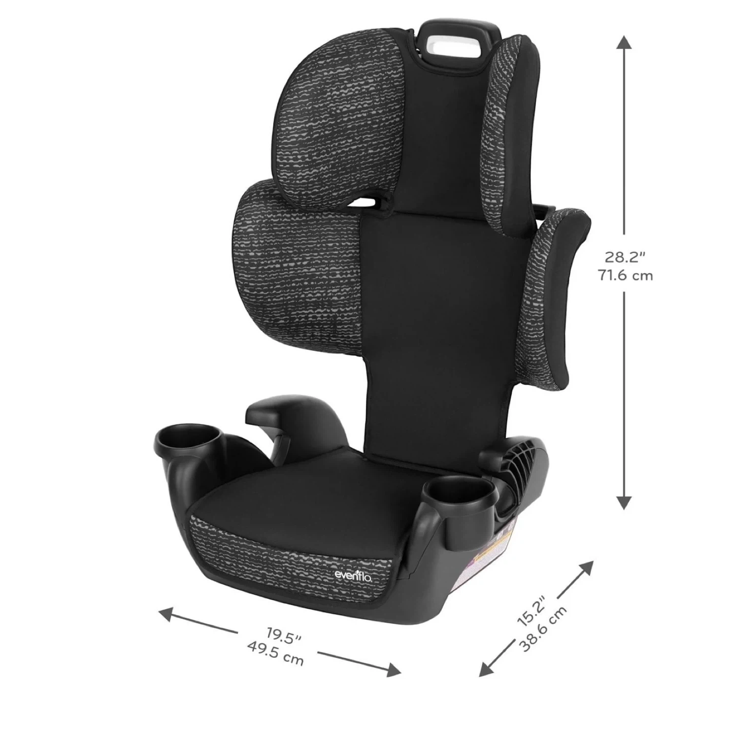 This Evenflo car seat is black with grey accents. It measures 28.2" tall, 19.5" wide, and 15.2" deep. Includes two cup holders.