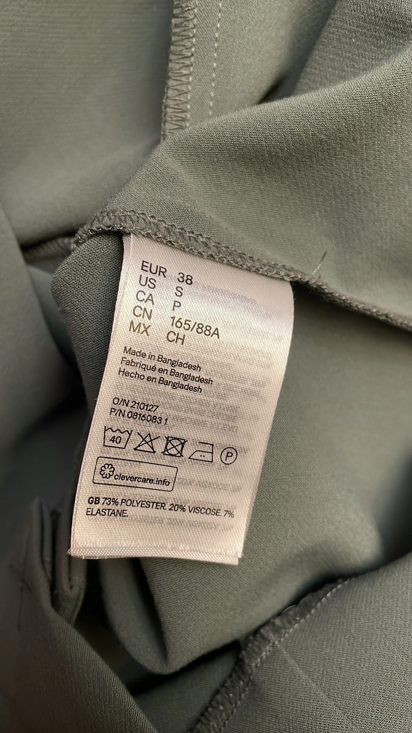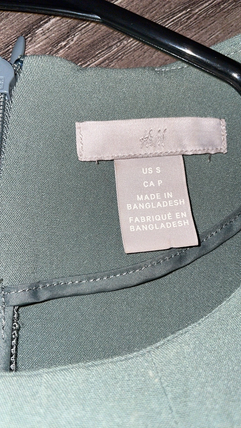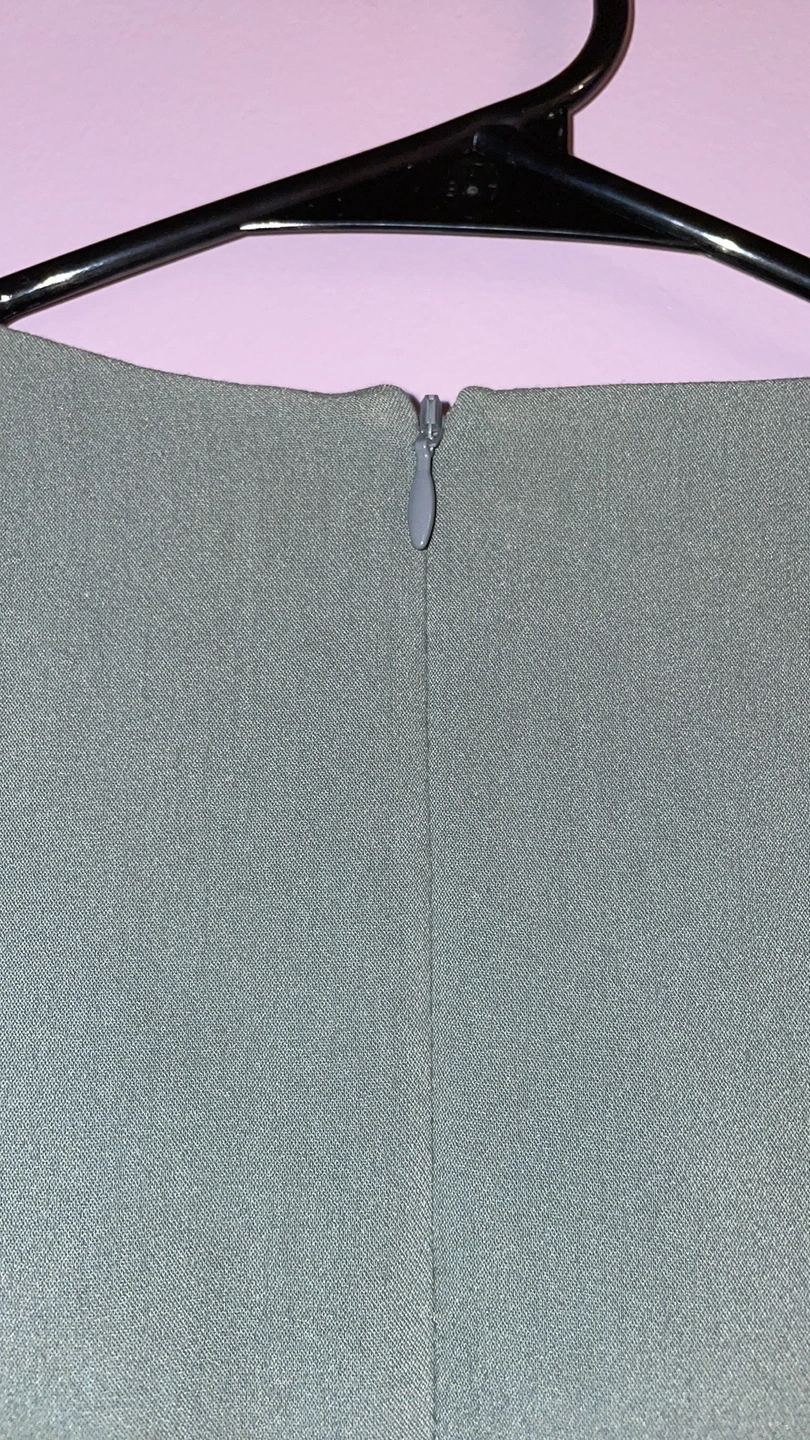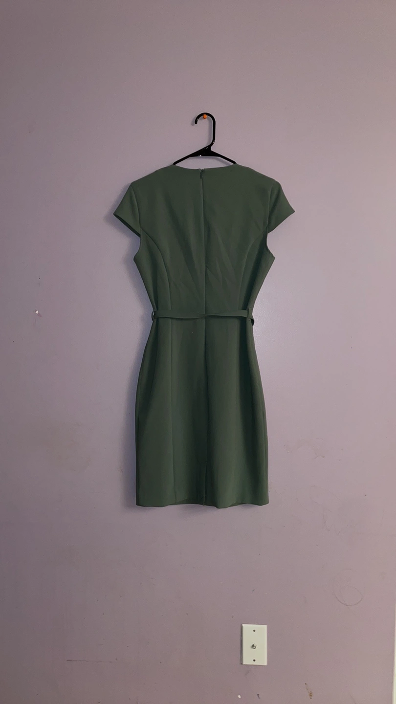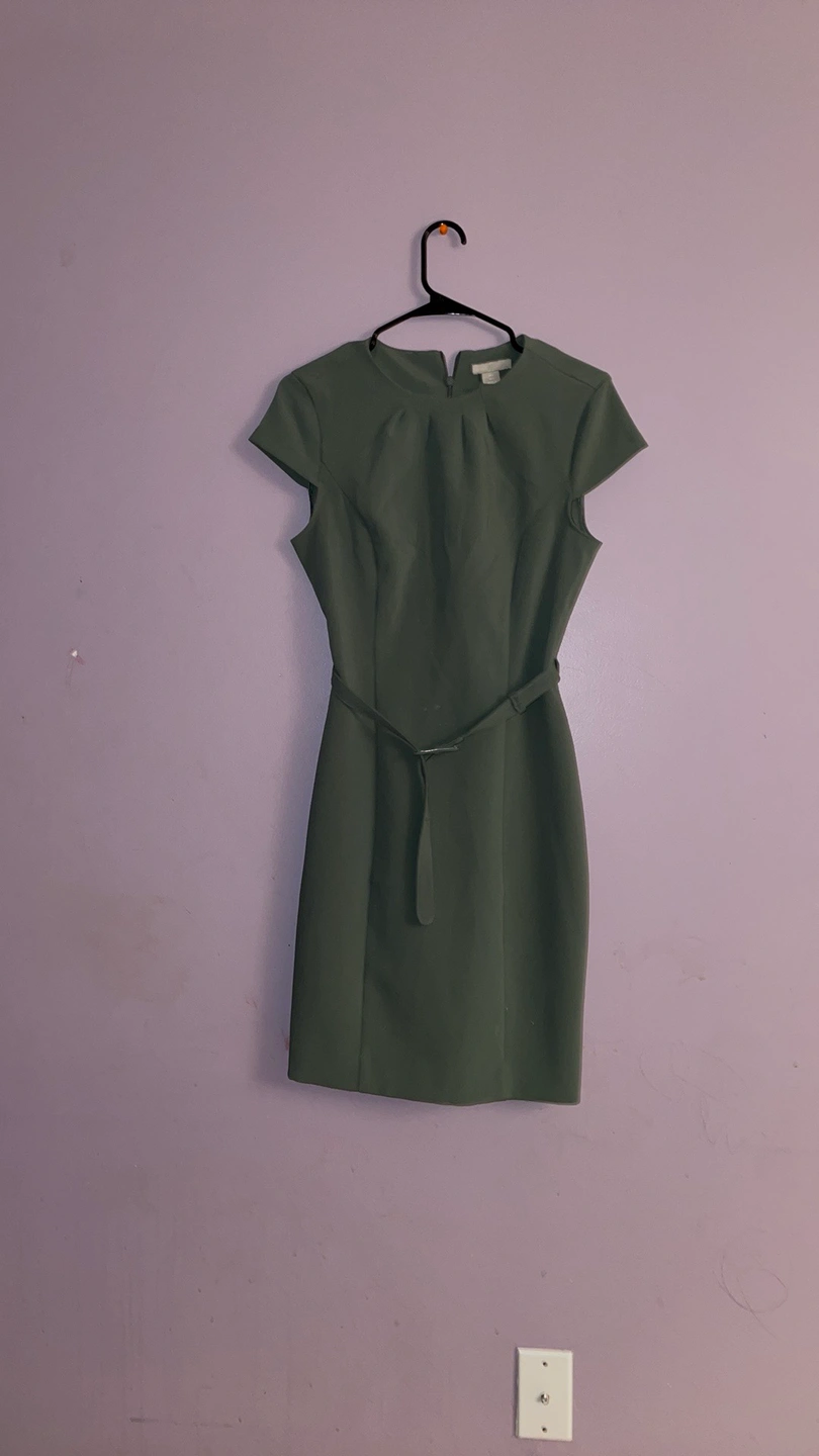 This is a green dress with a belt. It has a scoop neckline and short sleeves. It is a bodycon style dress and is a great option for a business casual outfit.