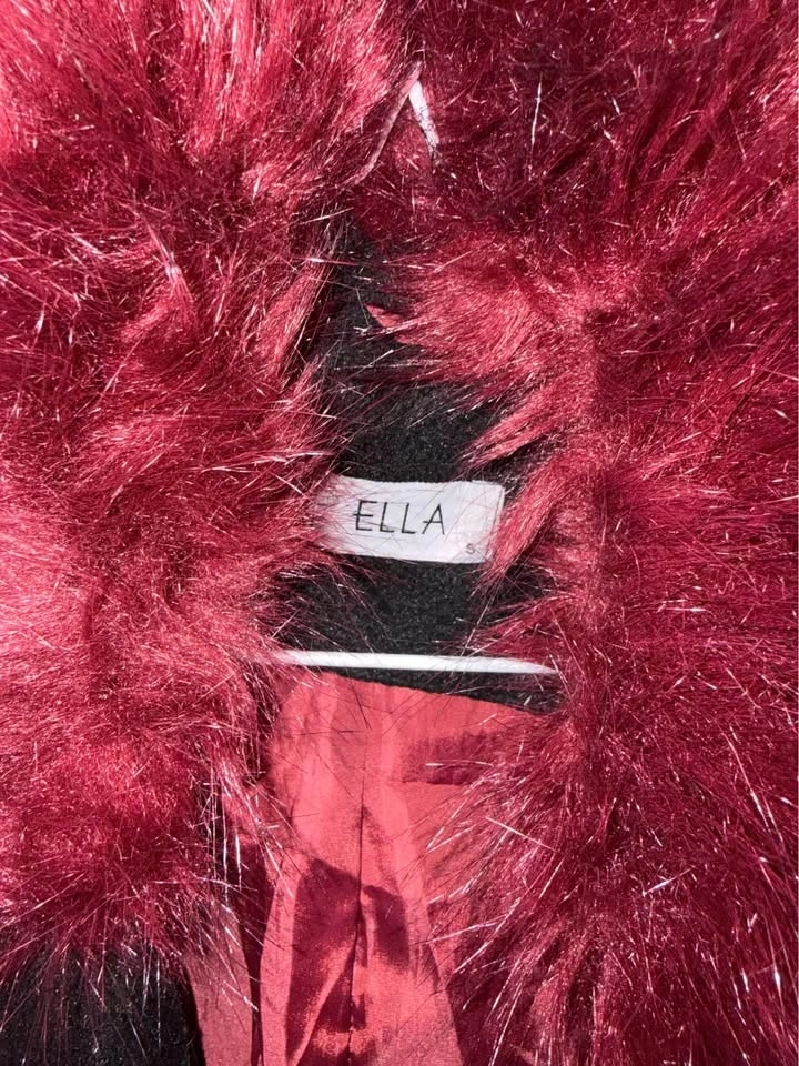 Elegant black wool blend coat with a bold burgundy/red faux fur collar and red satin lining. Stylish, warm, and perfect for fall or winter.