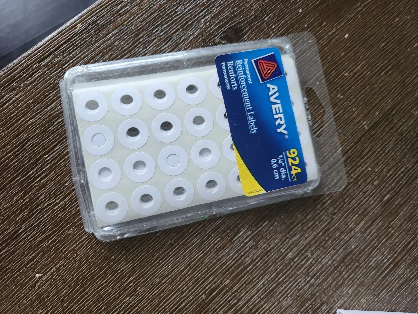 Permanent reinforcement labels by Avery. 1/4" diameter, 0.6 cm. Ideal for reinforcing punched holes in paper.