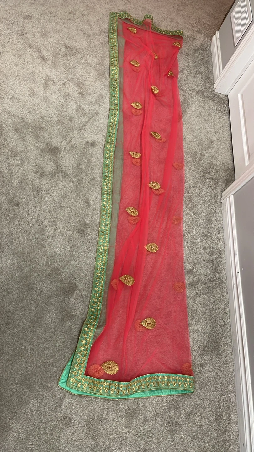 This set includes a vibrant pink net dupatta adorned with intricate gold embroidery and sequin work. It also comes with a matching blue velvet blouse featuring matching embroidery. The dupatta has a beautiful gold border and decorative tassels on the ends. An added extra is another Green and Pink Dupatta