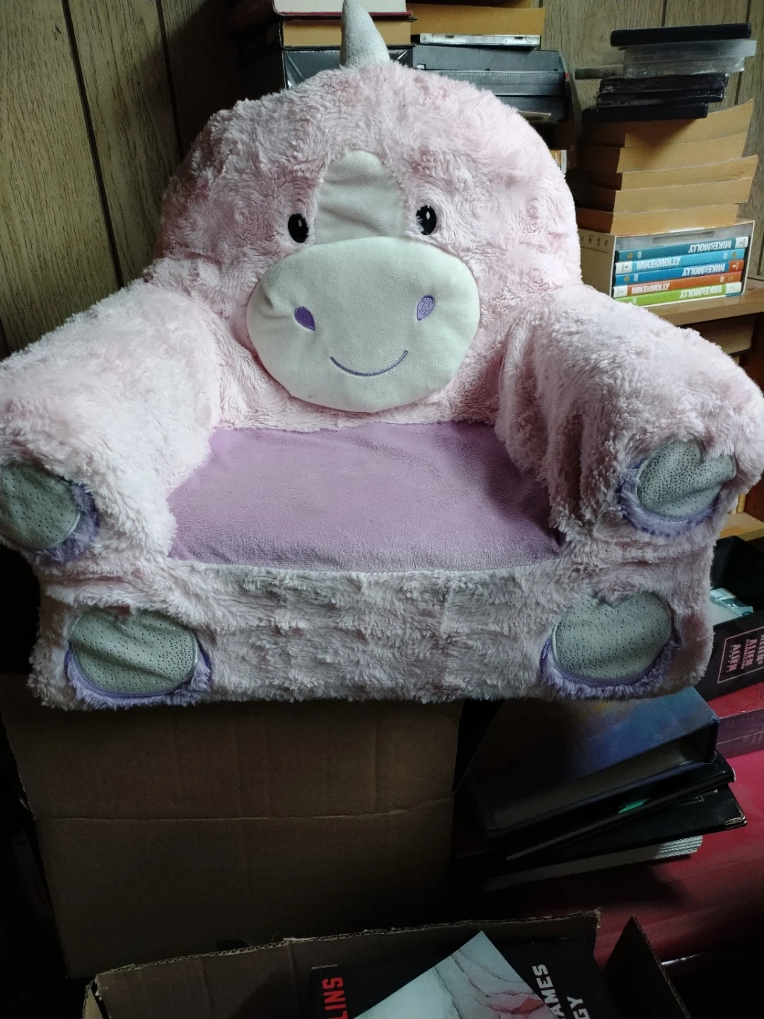 Super soft plush unicorn armchair for little ones. It's a cozy and fun seat, perfect for any child's room. The material is fuzzy and gentle for comfort.