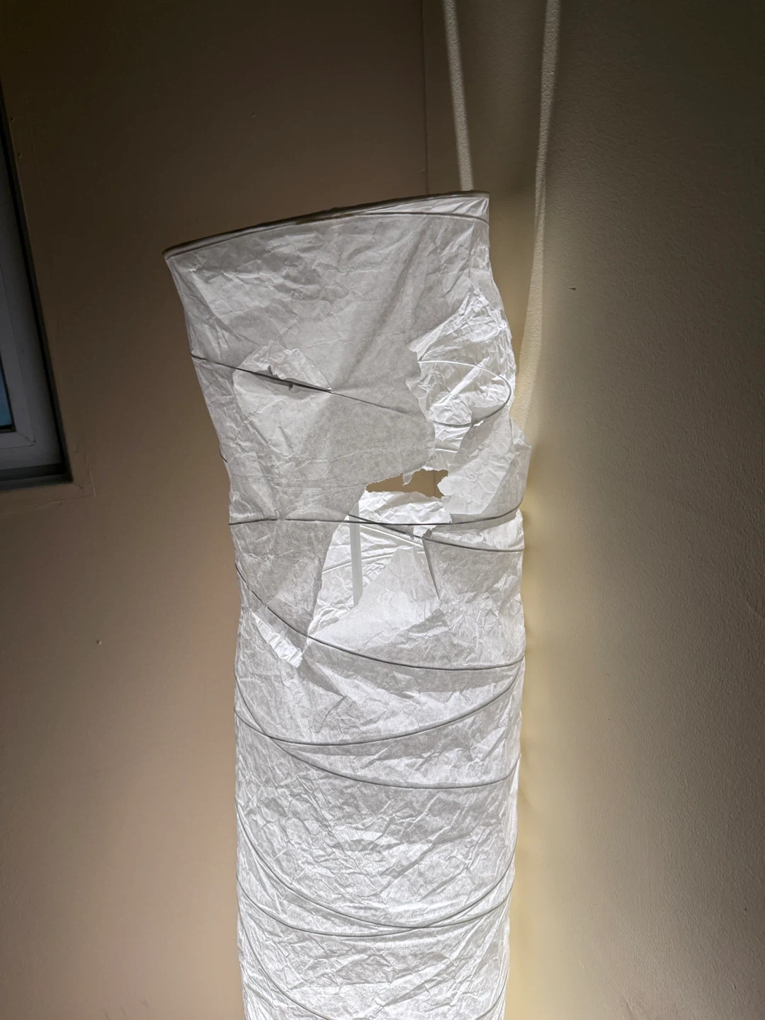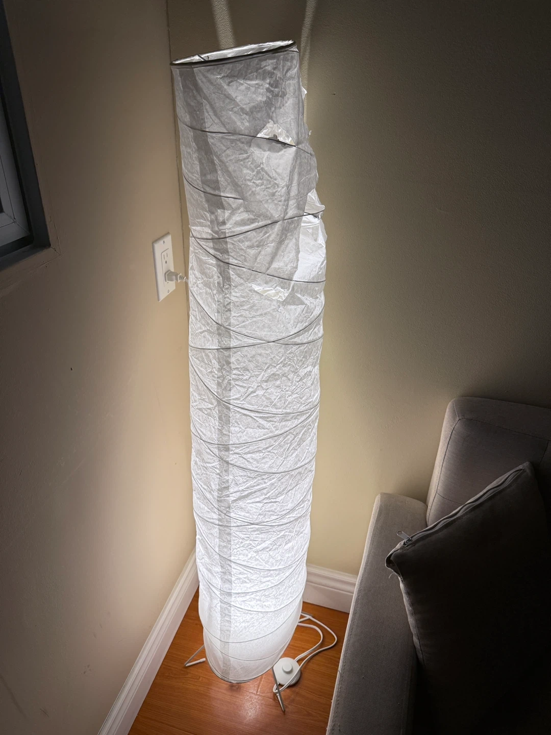 This is a white paper floor lamp. It's a tall, cylindrical design. The lamp has a wrinkled paper shade stretched over a wire frame.