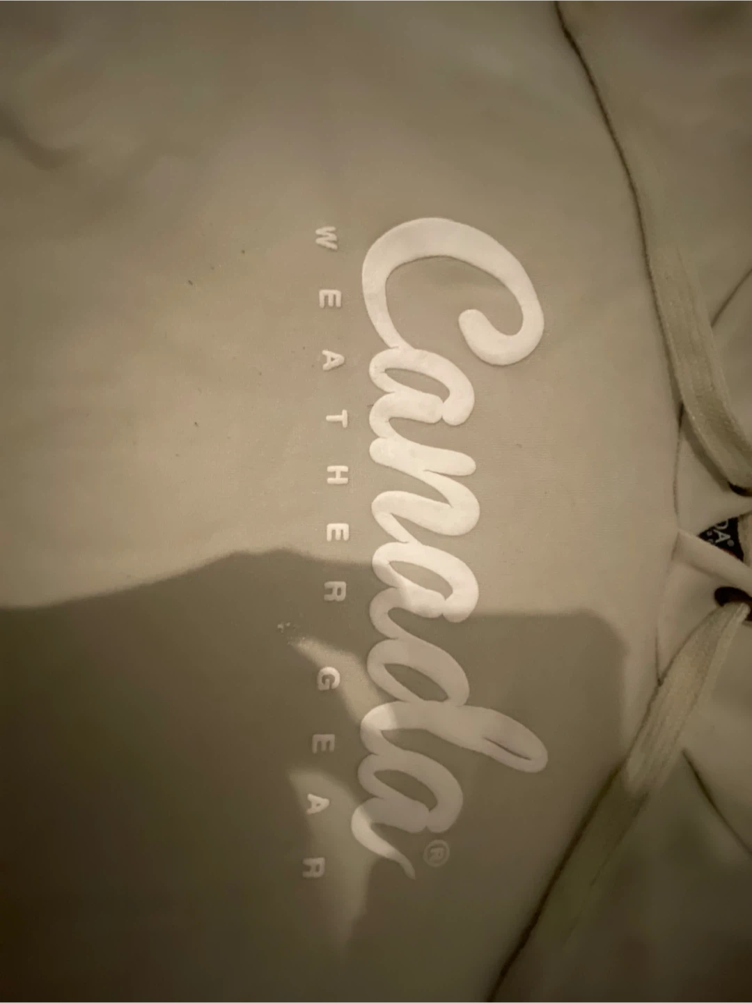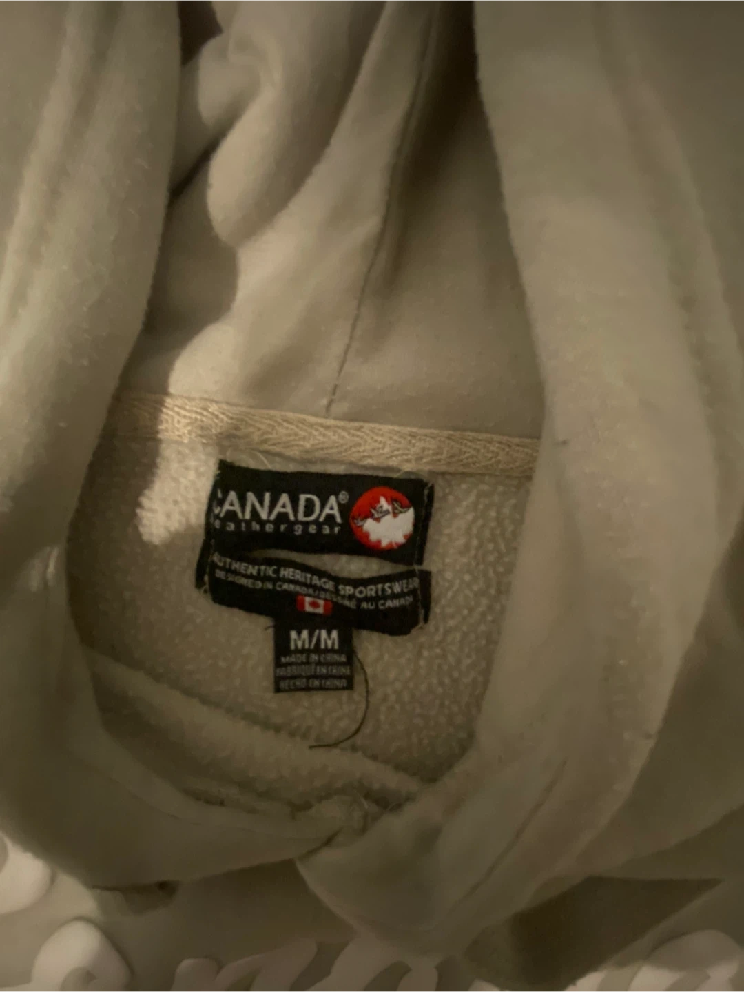 This Canada Weather Gear hoodie is a size M/M. It's a light tan colour with "Canada" written in white lettering across the chest. The material is a blend, common for hoodies, offering comfort and warmth. Open to trade