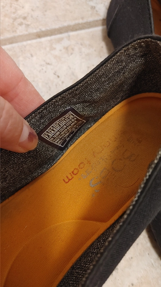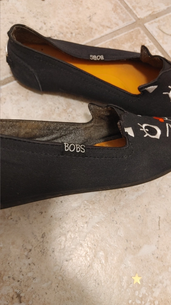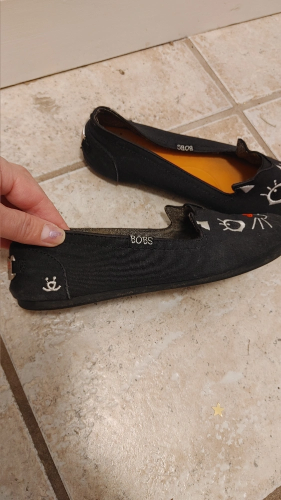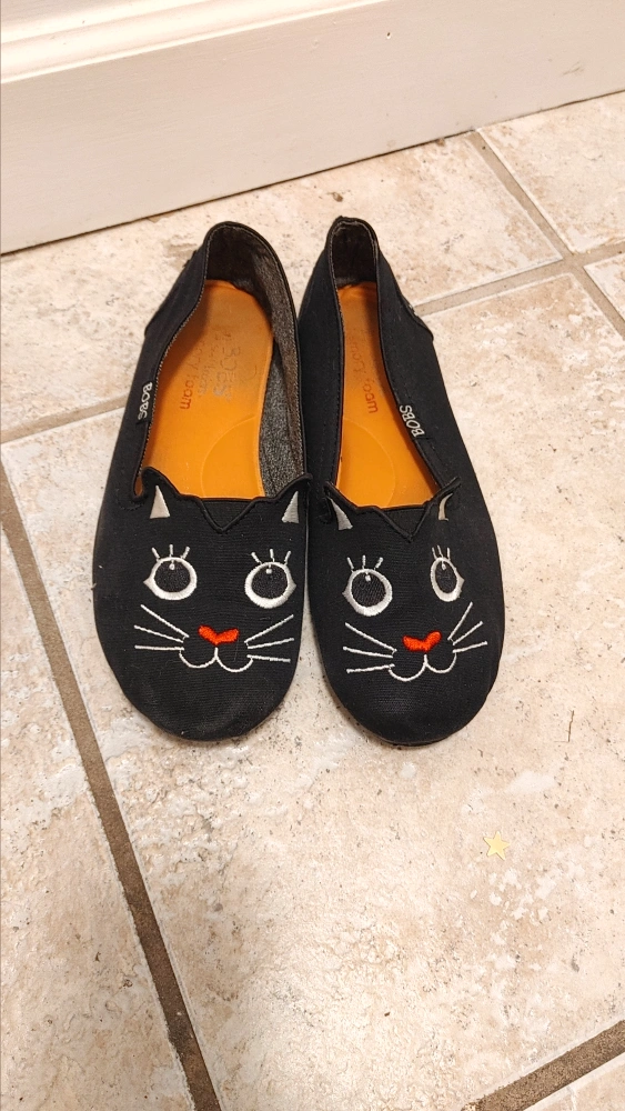 These BOBS for Cats flats are black with an embroidered cat face design. They're made of canvas with a cushioned insole. These shoes are fun for everyday wear!