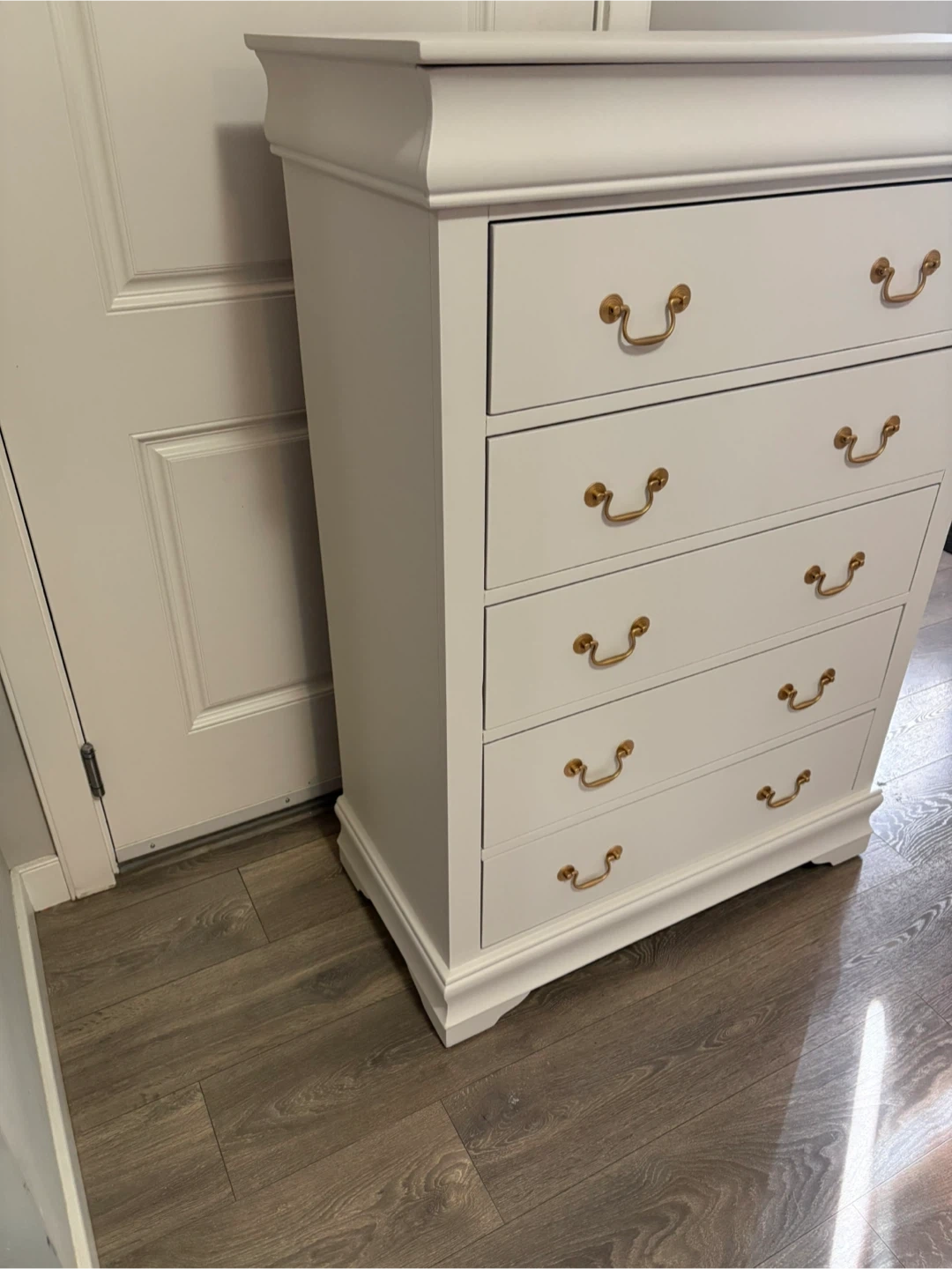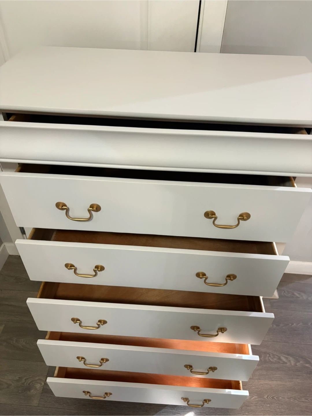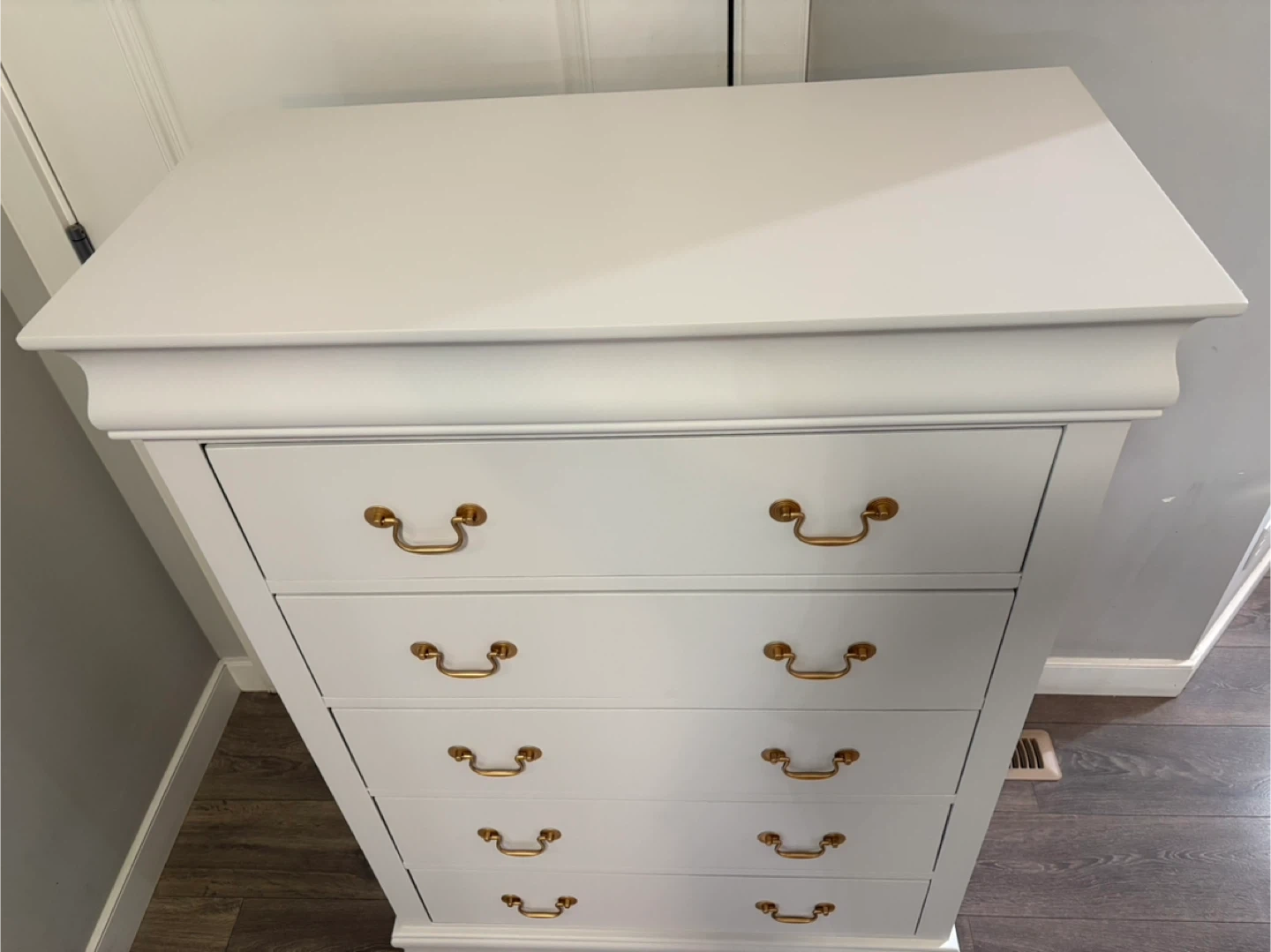 This is a charming solid wood dresser that has been refinished in neutral beige shade, perfect for adding a touch of elegance to any room! It features six drawers with gold hardware, providing ample storage. This dresser is in great condition. The drawers are very clean and slide smooth with locking rails.