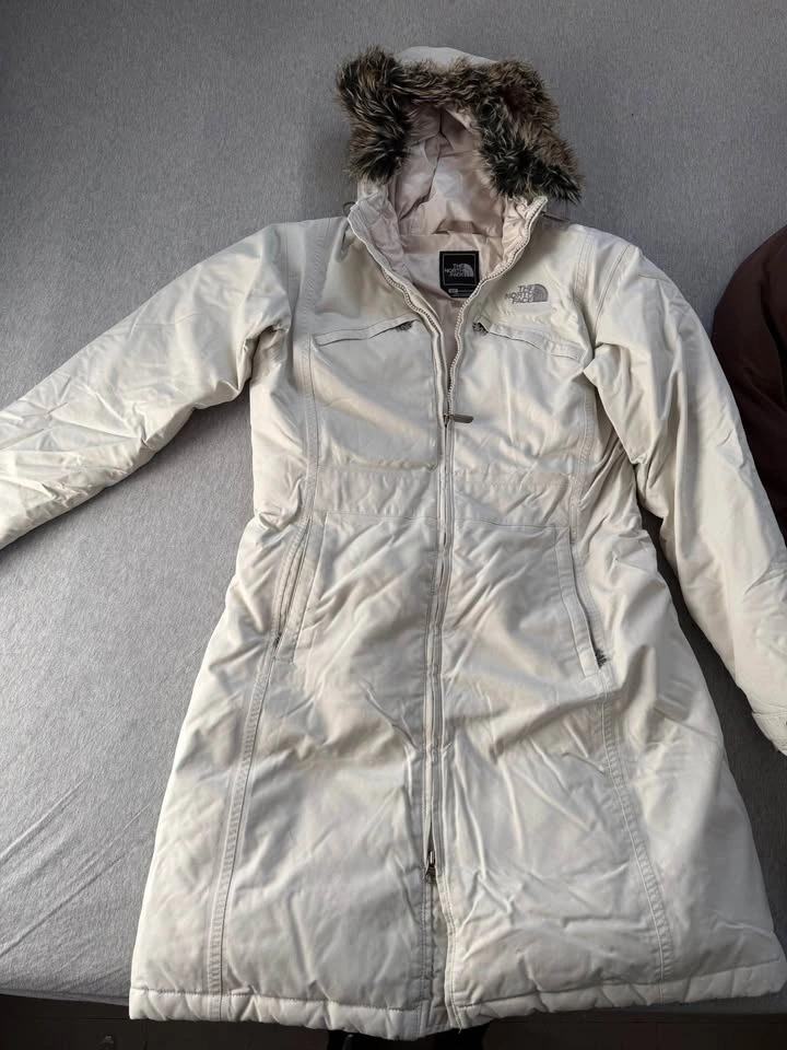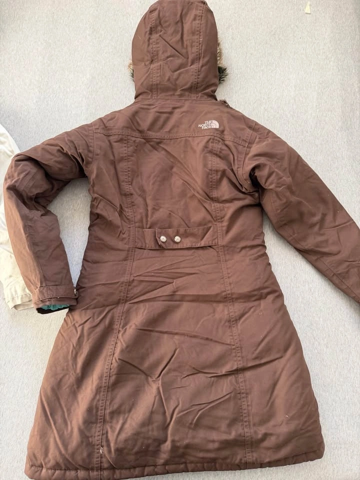 The North Face Women's Arctic Parka in light and brown. Both are in good used condition, size small. The brown one has a small rip on the shoulder. As is.