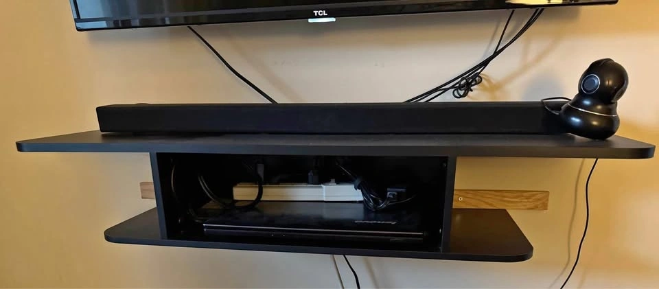 Moving sale. Wall mounted floating shelf for TV console with lots of storage pockets. Dimensions 41" length, 12" width, 7" height. Pick up in the Port Royal neighborhood in Queensborough, New Westminster.