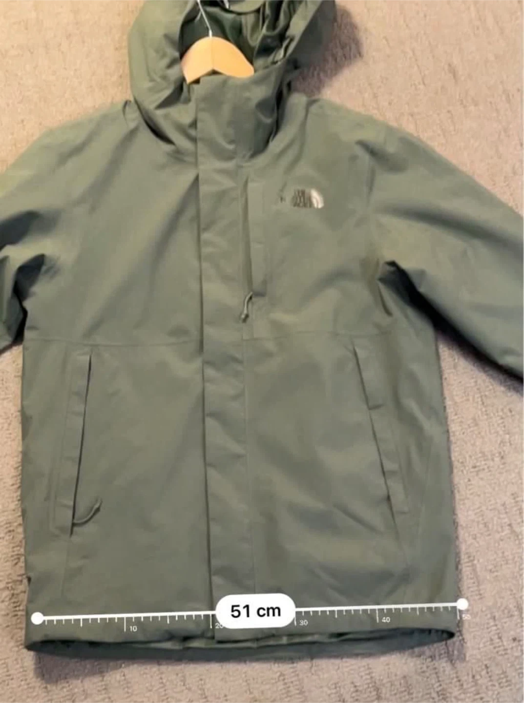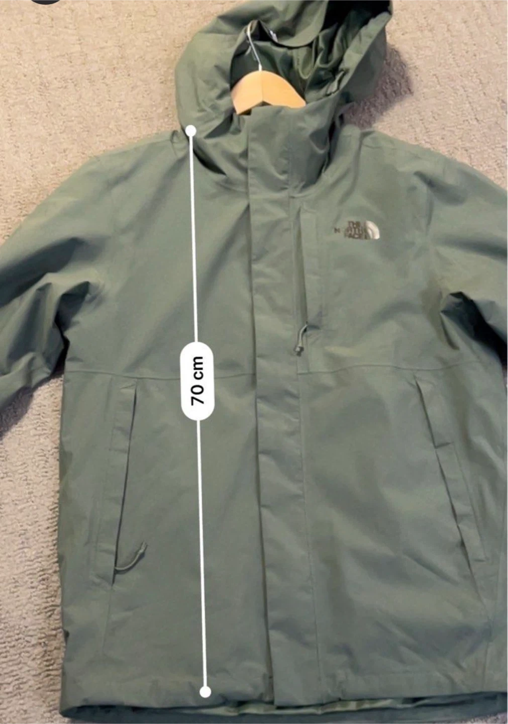 Here's a The North Face rain jacket in a nice olive green colour! The measurements are approximately 51cm across the bottom, 70cm in length, 41cm across the shoulders, and the sleeves are 79cm long