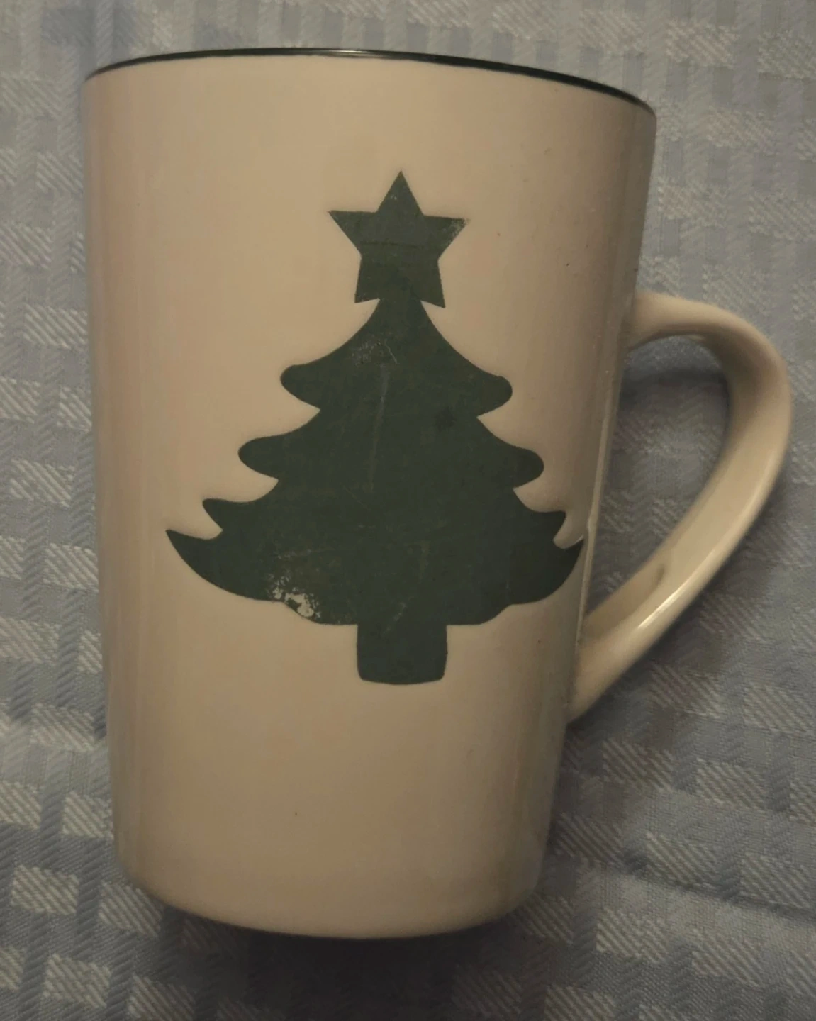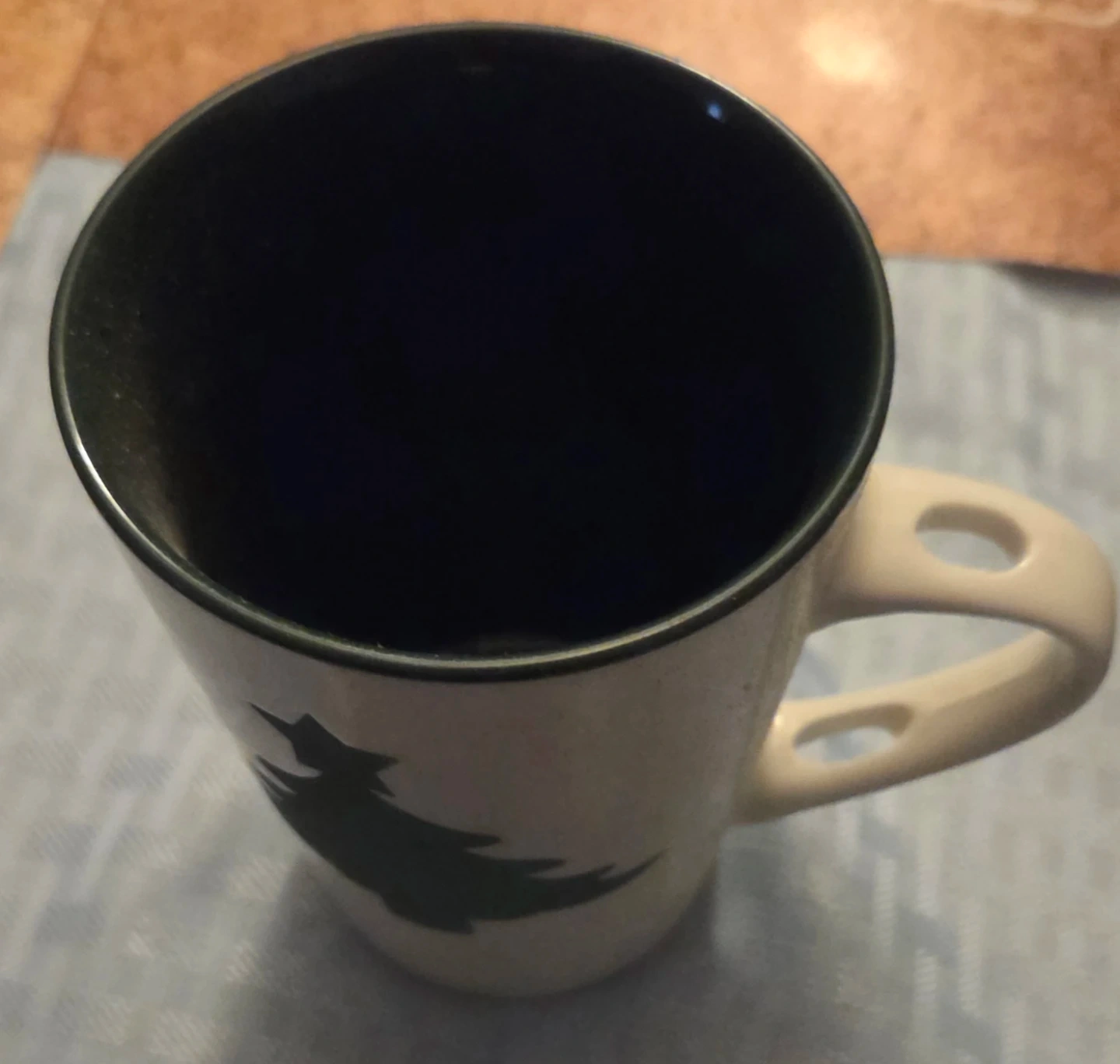 Cream coloured mug with a dark green Christmas tree design and a black rim. It's perfect for your morning coffee or tea! No spoon