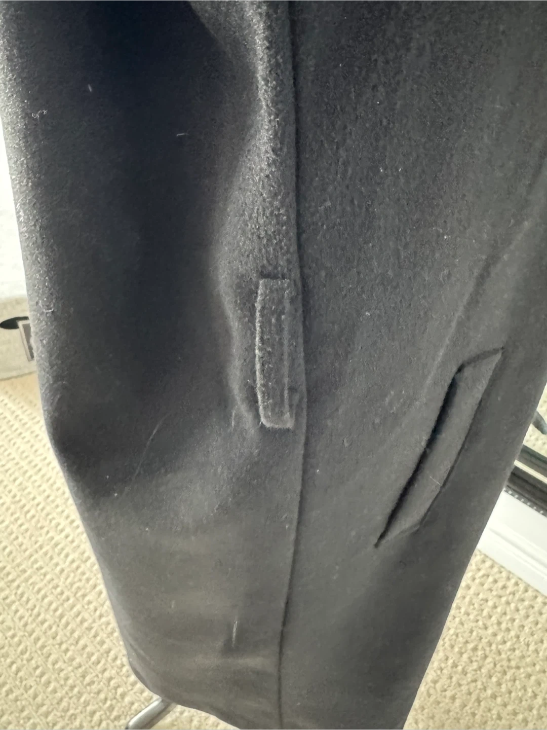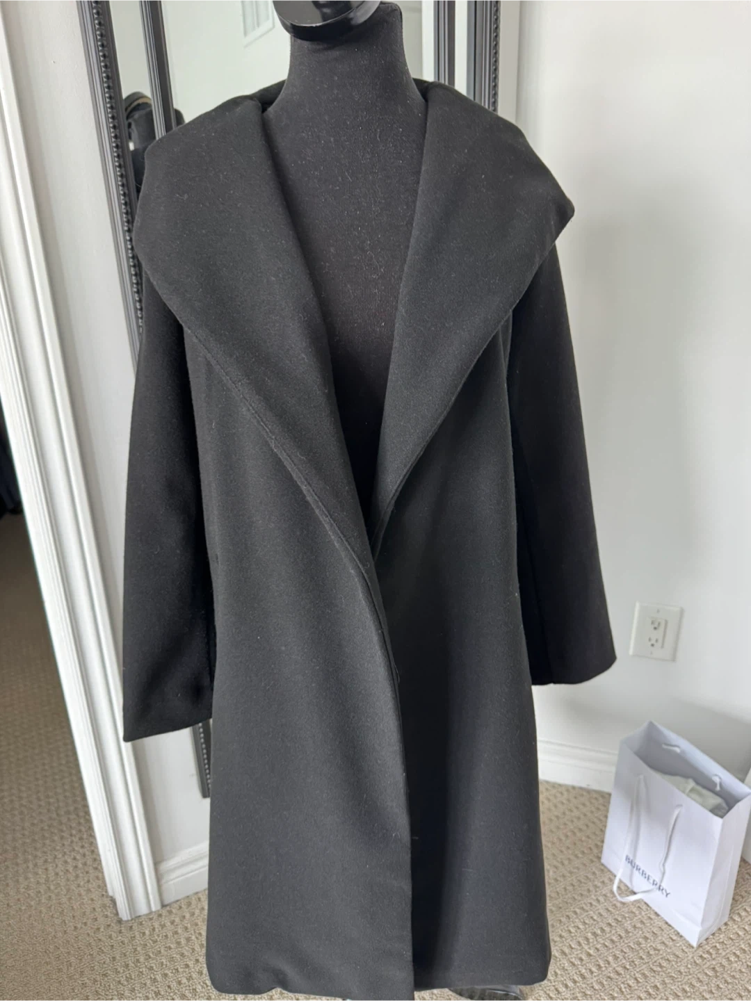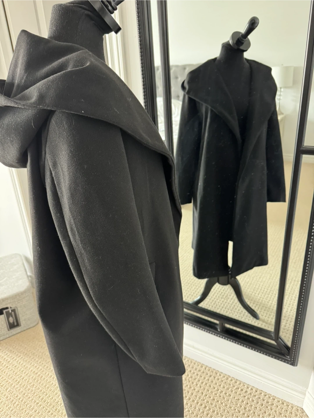 Cozy black wool blend coat with a generous hood and open front design. Features side pockets for convenience. It's a versatile layering piece for cooler weather.