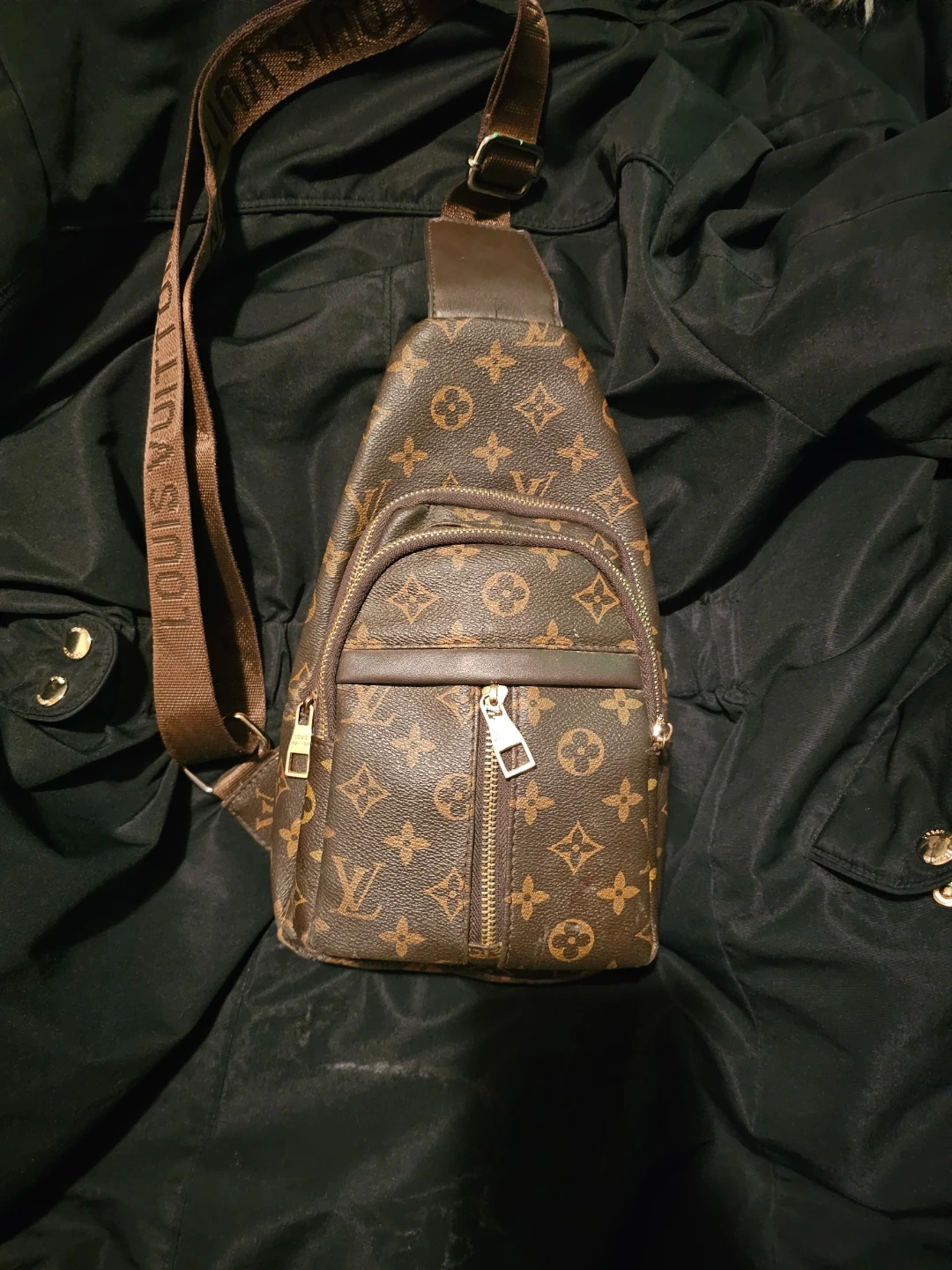 This is a Louis Vuitton sling backpack with the signature monogram pattern. It features a zip closure and an adjustable strap. This bag's compact size makes it handy for everyday use.