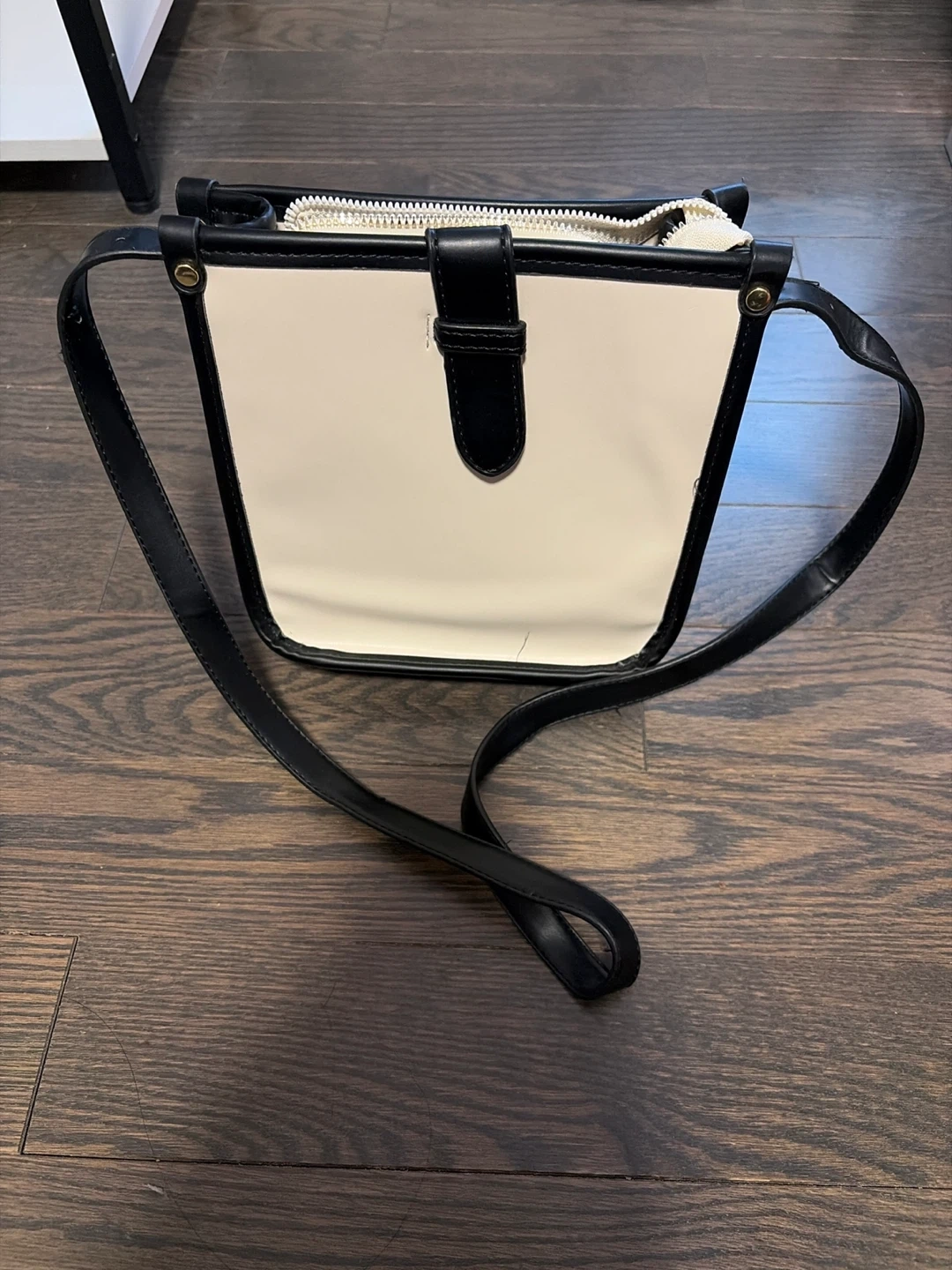 A stylish black and white crossbody bag. It has a zip closure and an adjustable strap. This bag is perfect for everyday use!