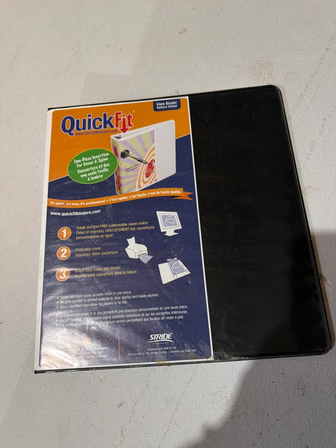 Selling a Quickfit View Binder in black. It's in good condition and ready to keep your documents organized! It features a one-piece insertion for the cover and spine, making it easy to personalize. The binder also has inside pockets for extra storage