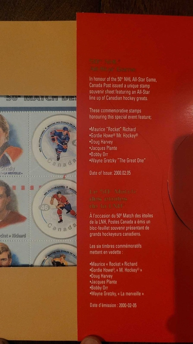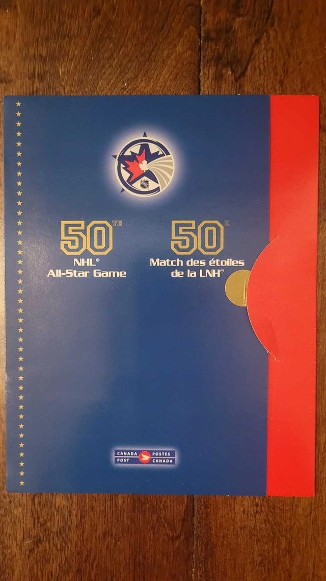 Own a piece of hockey history with this commemorative souvenir sheet celebrating the 50th NHL All-Star Game! This collectible sheet features stamps of hockey legends like Wayne Gretzky, Gordie Howe, and Maurice "Rocket" Richard. It's in excellent condition, a must-have for any hockey fan or stamp collector. From a pet and smoke-free collection. Pickup in the Lakeshore/Islington area.