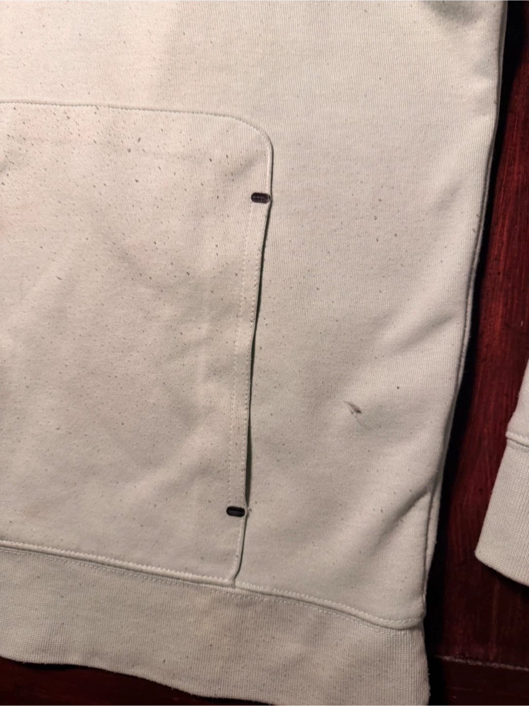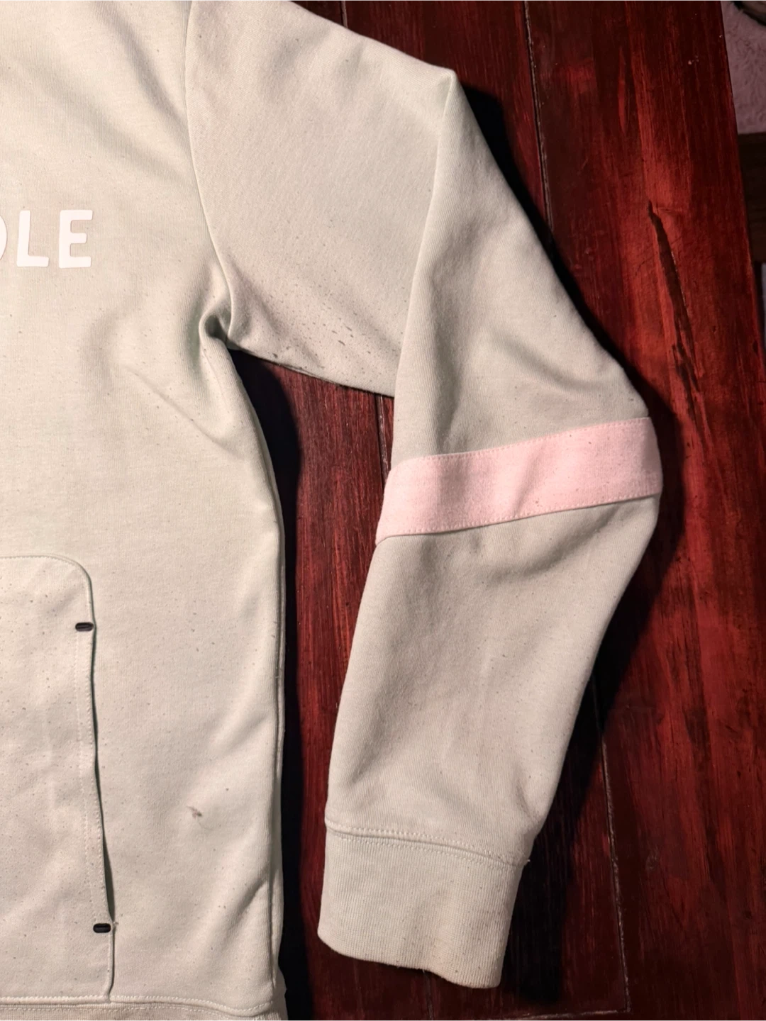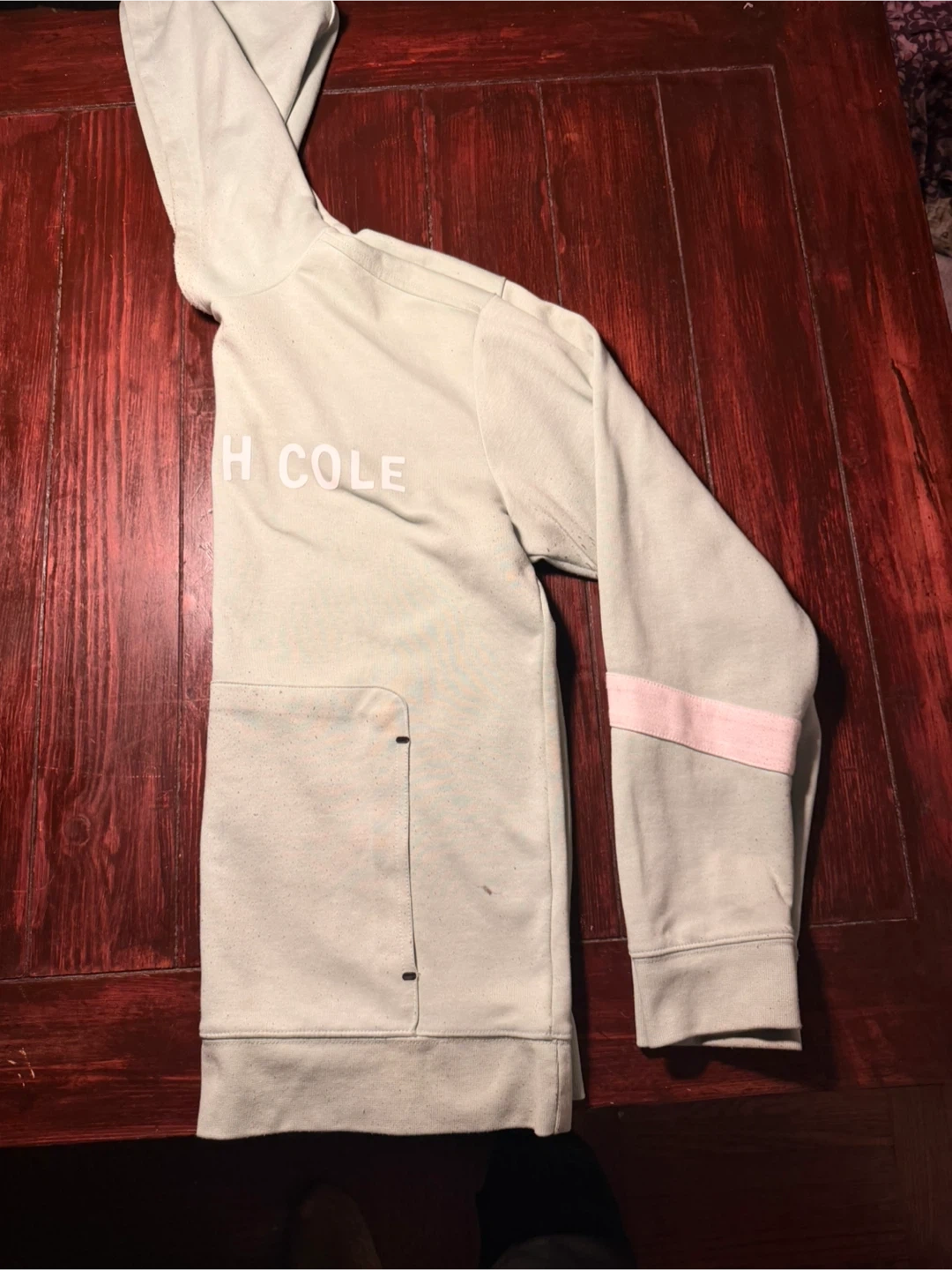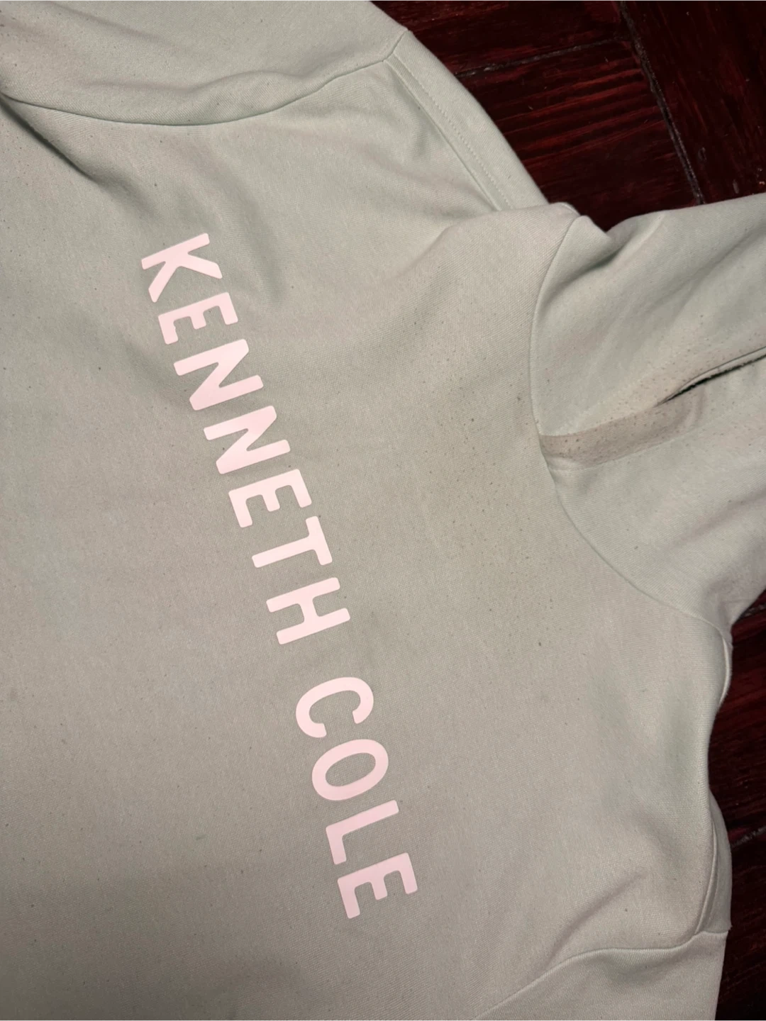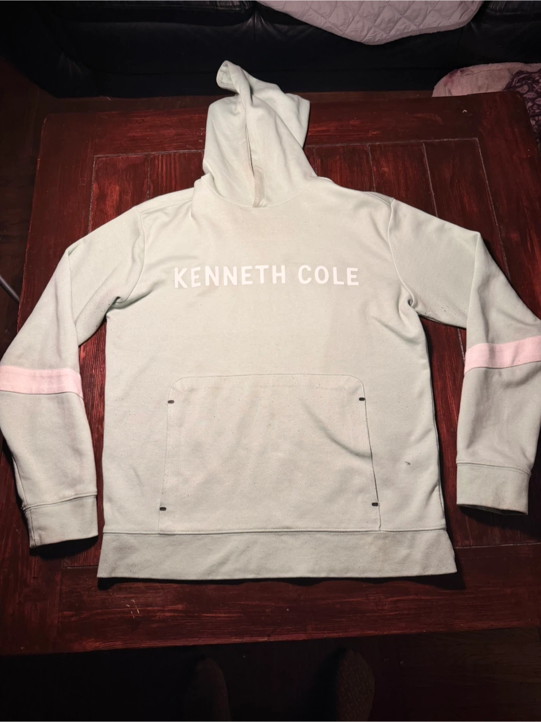 Lightweight hooded sweatshirt with "KENNETH COLE" logo across the chest. Features a front pouch pocket and pink accent bands on the sleeves. Comfortable and casual.