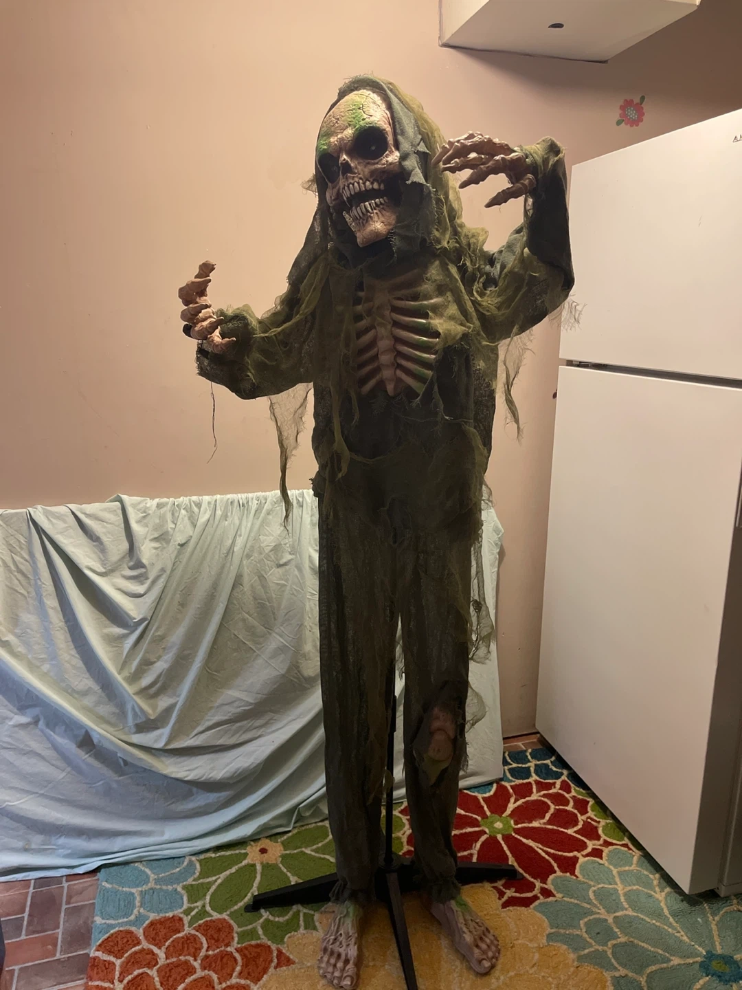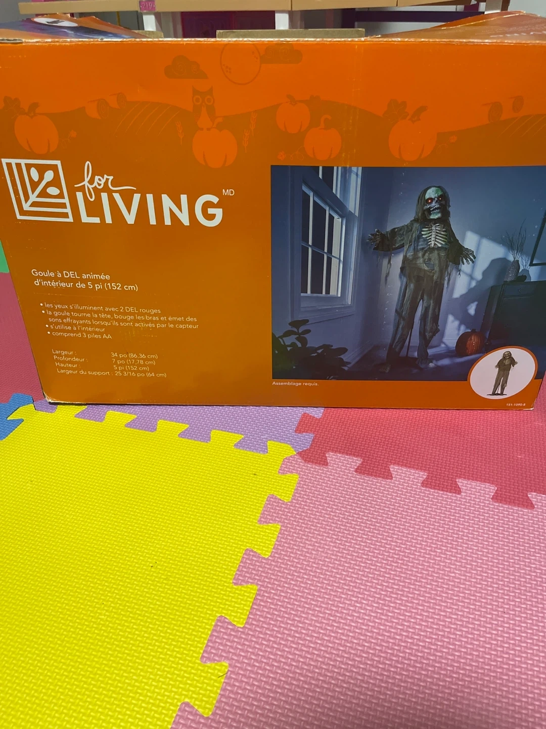 Spook up your Halloween with this For Living animated ghoul! It's 5 feet tall and ready to add some fright to your decor. The ghoul's eyes light up with 2 red LEDs, and it makes spooky sounds when activated by the sensor. Requires AA batteries. Perfect for indoor use!