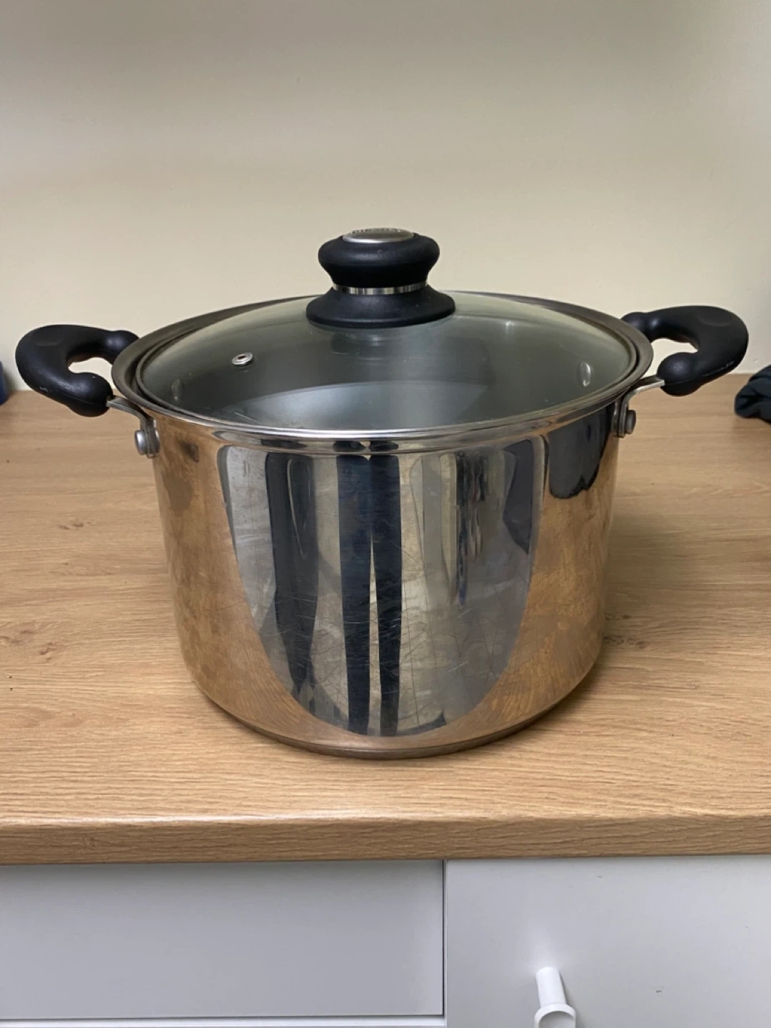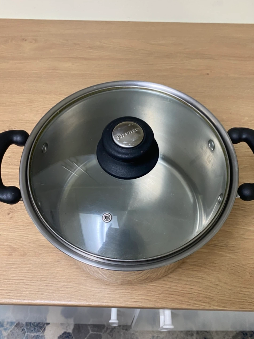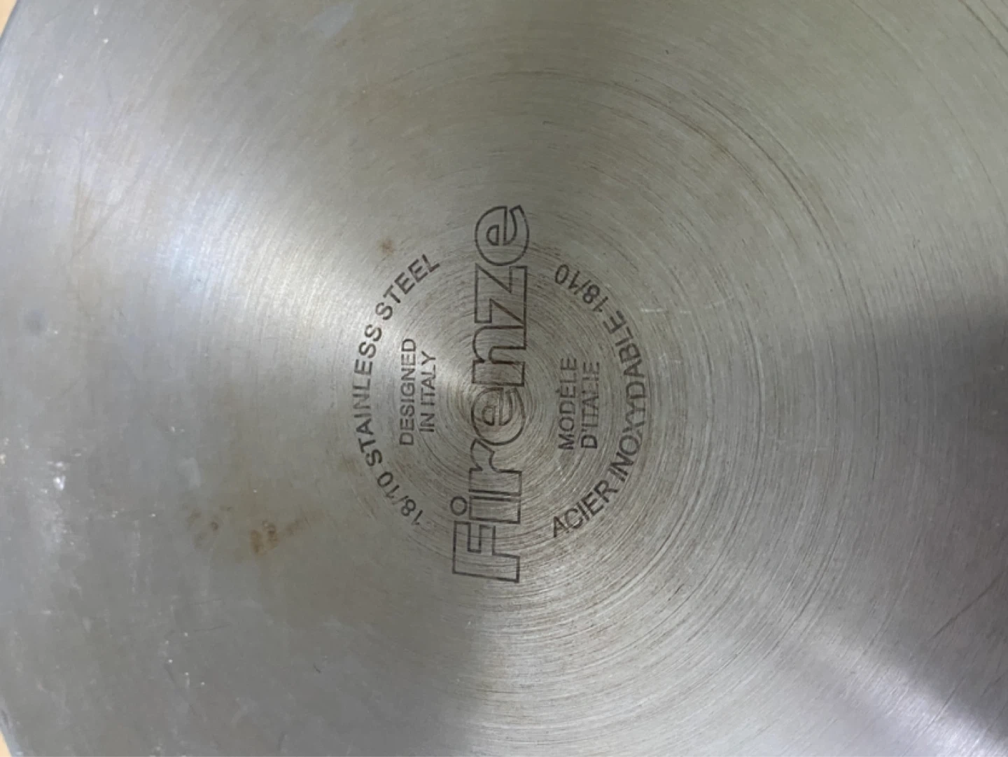 This is a stainless steel stock pot from Firenze, designed in Italy. It's made with 18/10 stainless steel and includes a glass lid with a black handle. This pot is great for making soups or stews!