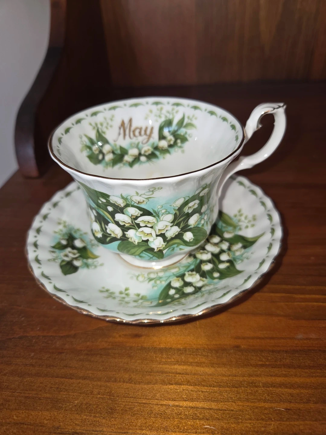 This delicate teacup and saucer set features a beautiful 'May' inscription surrounded by lily of the valley blossoms. Porcelain material with a gold-trimmed edge. It's perfect for a tea lover or collector.