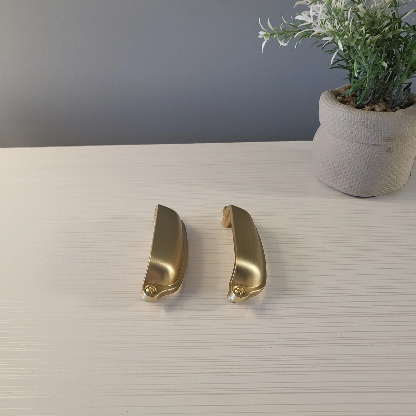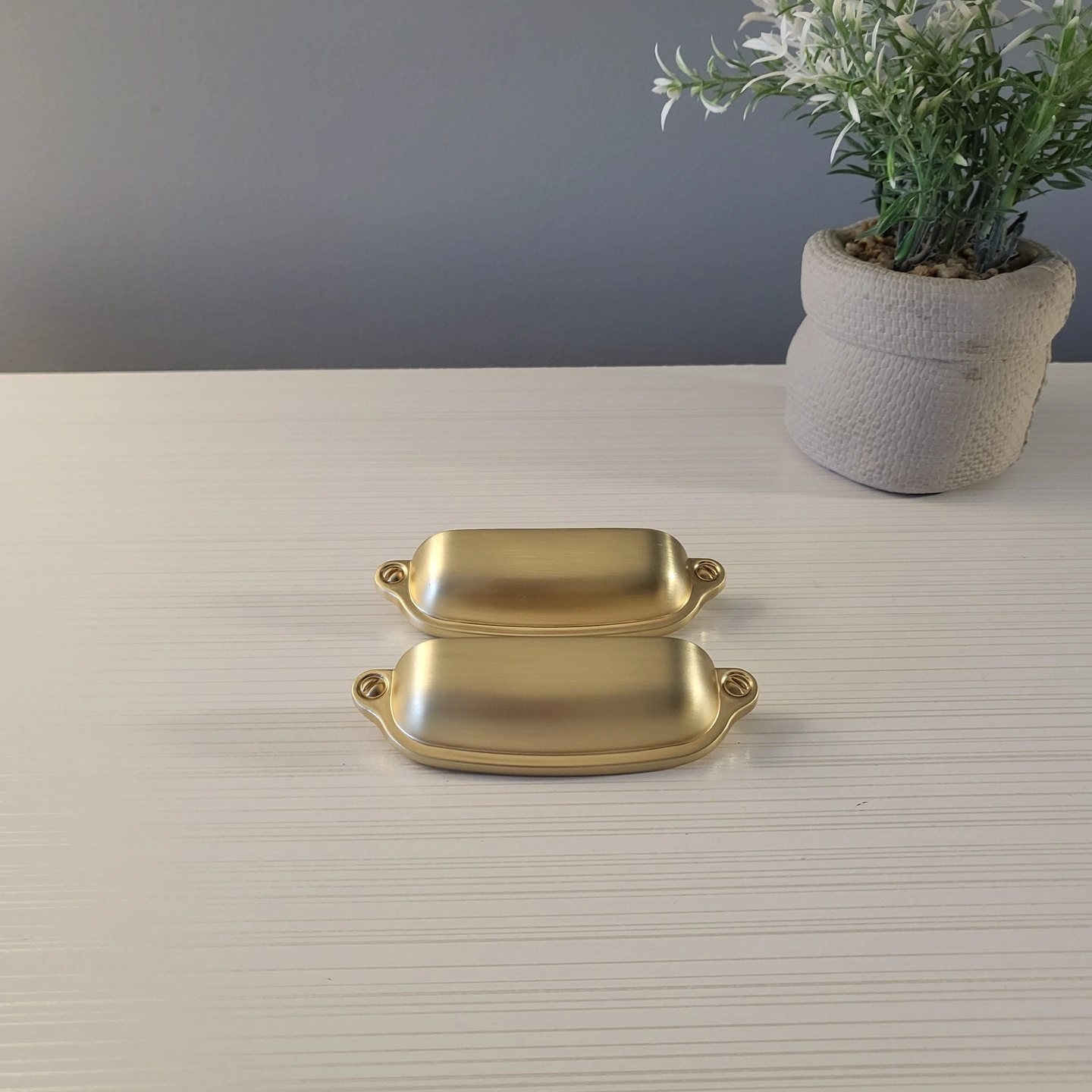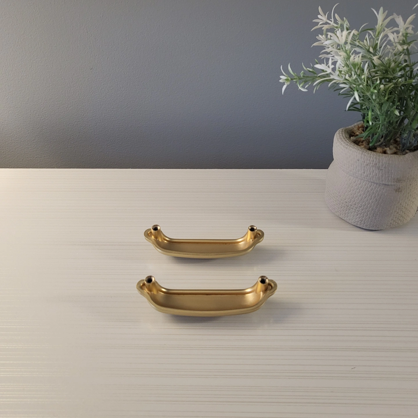 I am offering this classy set of brushed-gold cup-style cabinet handles. These are perfect for sprucing up an old piece of furniture!