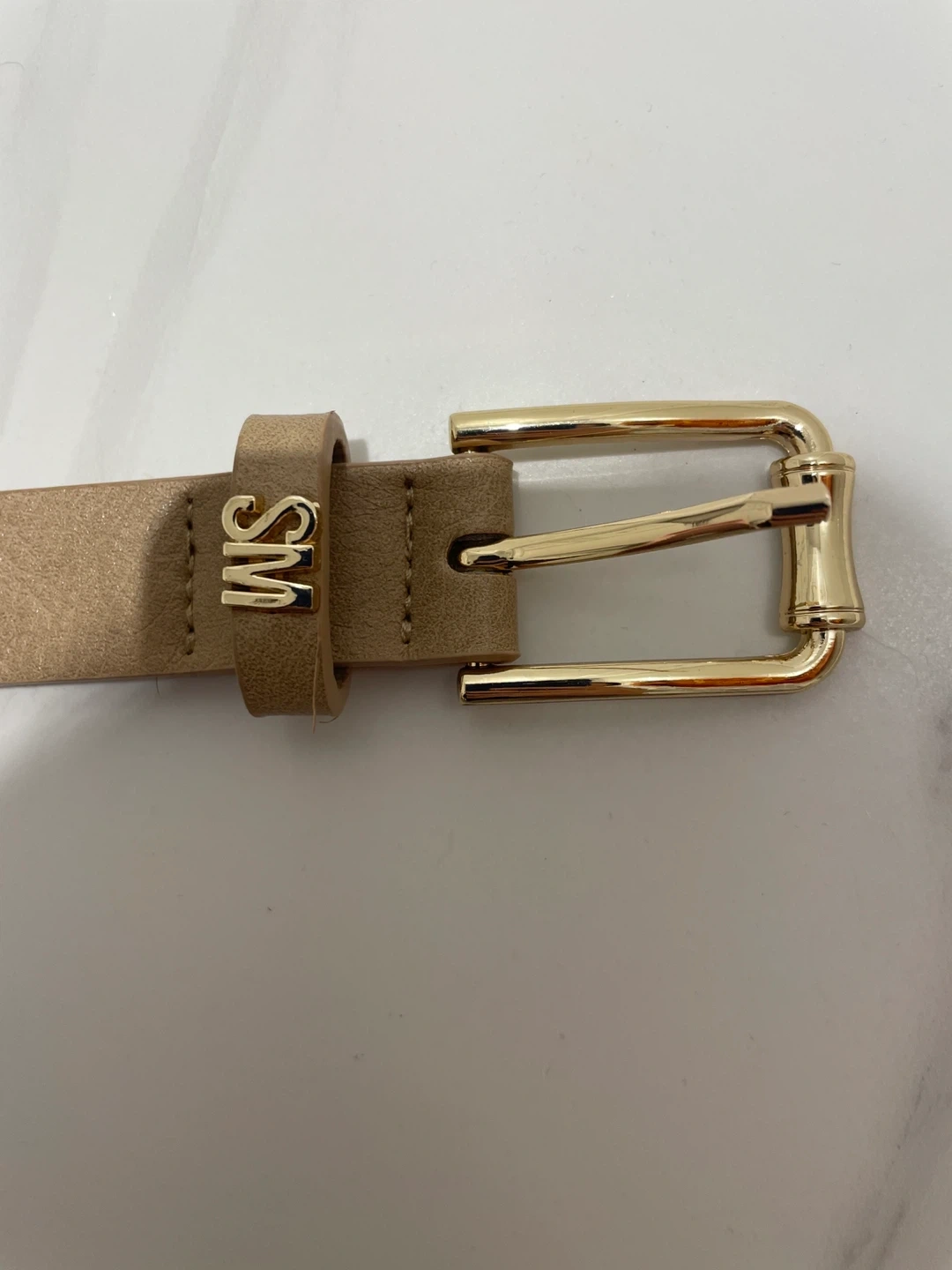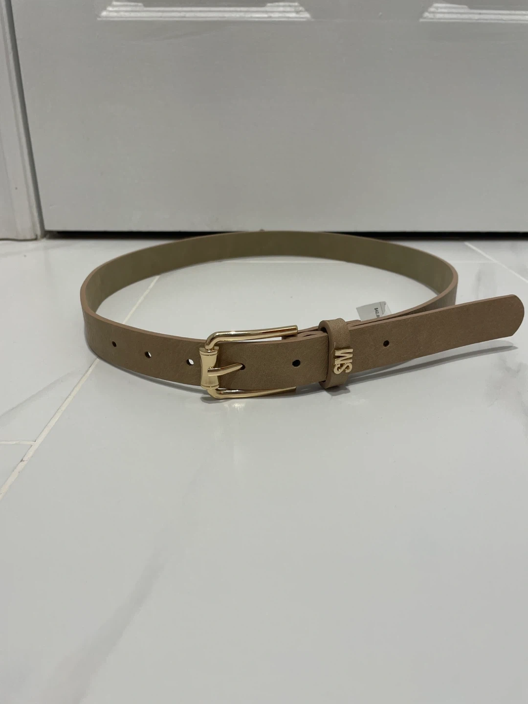 Women’s Steve Madden leather belt in tan. Size small, featuring gold hardware and a classic buckle. In excellent condition with no visible wear only used once or twice. Original price is $42.
