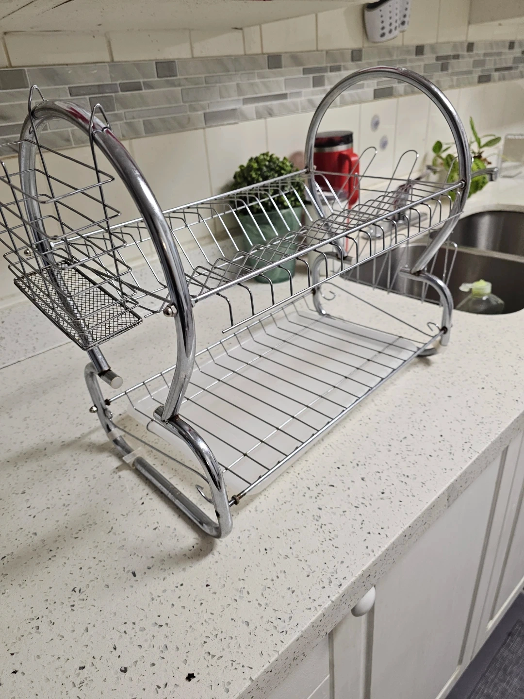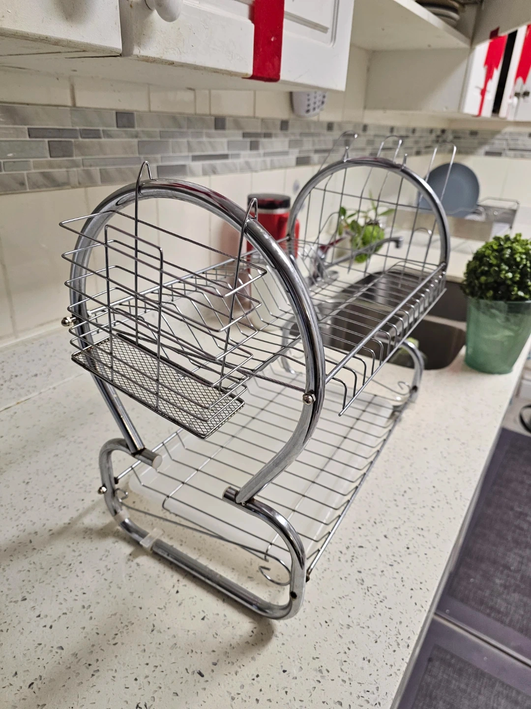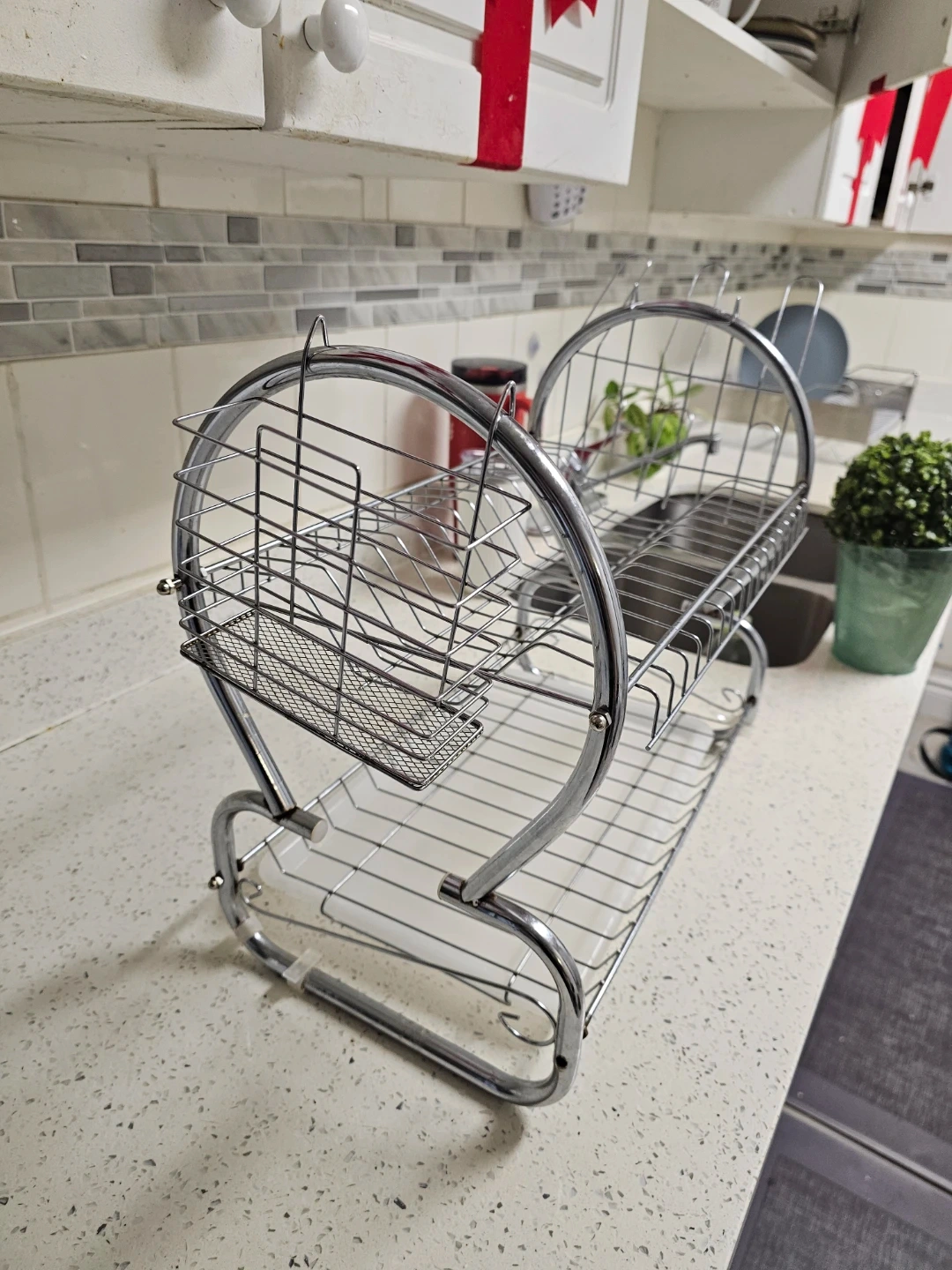 A two-tier chrome-plated dish drying rack for your kitchen. It's designed with ample space for plates, bowls, and cutlery. This rack is perfect for organizing dishes after washing.