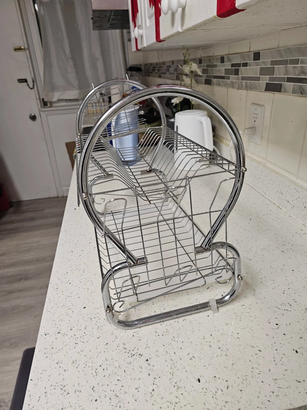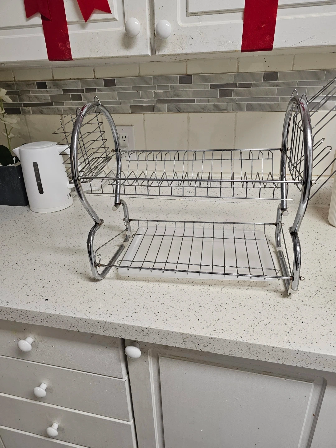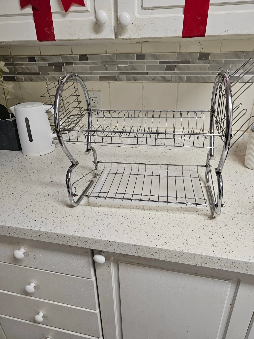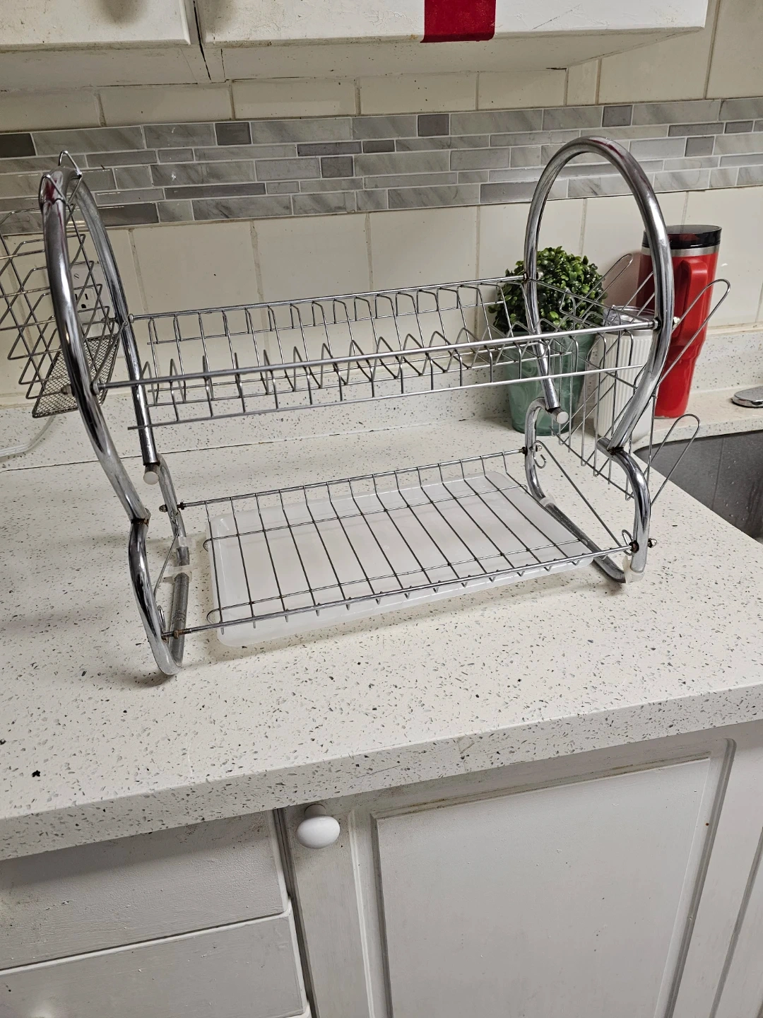 A two-tier chrome-plated dish drying rack for your kitchen. It's designed with ample space for plates, bowls, and cutlery. This rack is perfect for organizing dishes after washing.